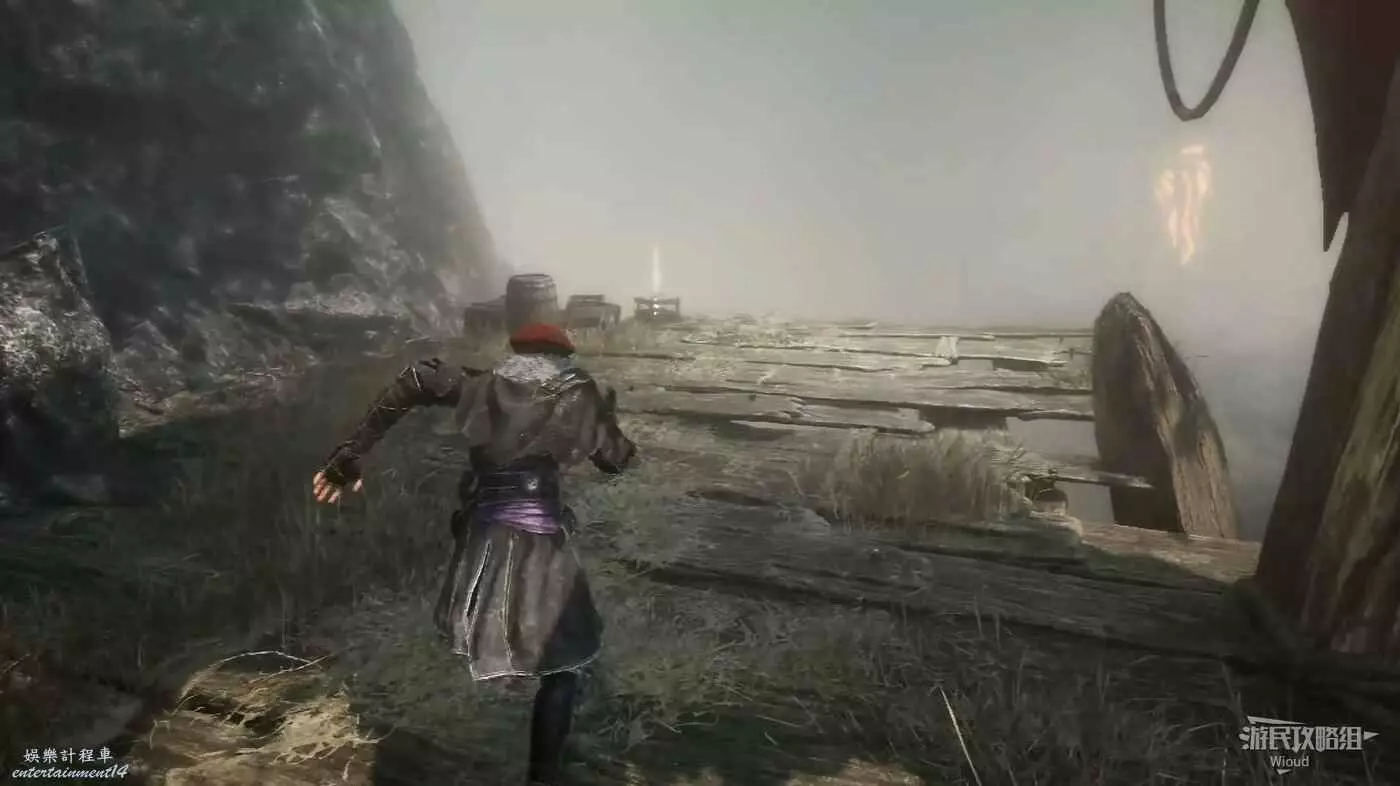 先拾取一些源色,使用鉤爪跳到第三個平台上通過繩索往下走,底部光點可拾取符紋【恩惠療愈】。