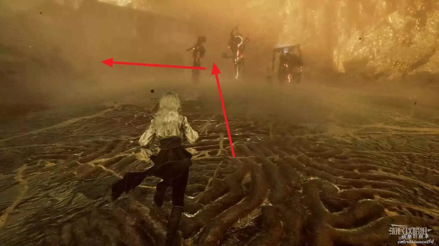 走到另一側看到一個拱門,沿著下圖路線,在下坡底下往右後方繞一圈,撿一個【靈光色】從左側通道出來往拱門左側道路走。