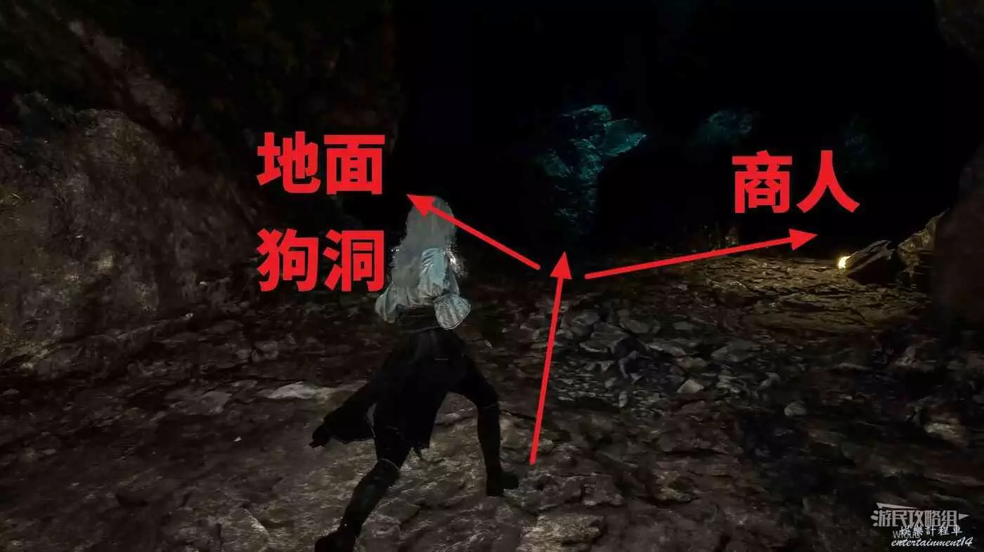 走出隧道,貼著右牆一直走,直到看見一個有亮光的上坡,從鉤爪點跳上去,轉頭跳到身後平台。