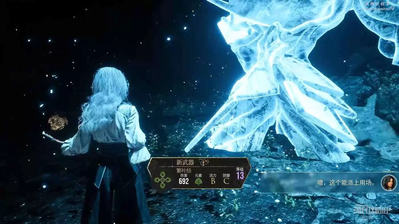 此平台從路燈的位置跟隨箭頭跳下去,貼著左牆一直走,可在一個被凍住的敵人旁撿到武器【繁葉結】。