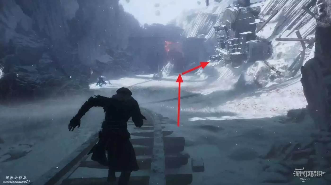 這個區域右側有個紅色怪物,將其擊敗可獲得符紋【以死引燃】,下圖怪物位置右側軌道處有個往下走的繩索。