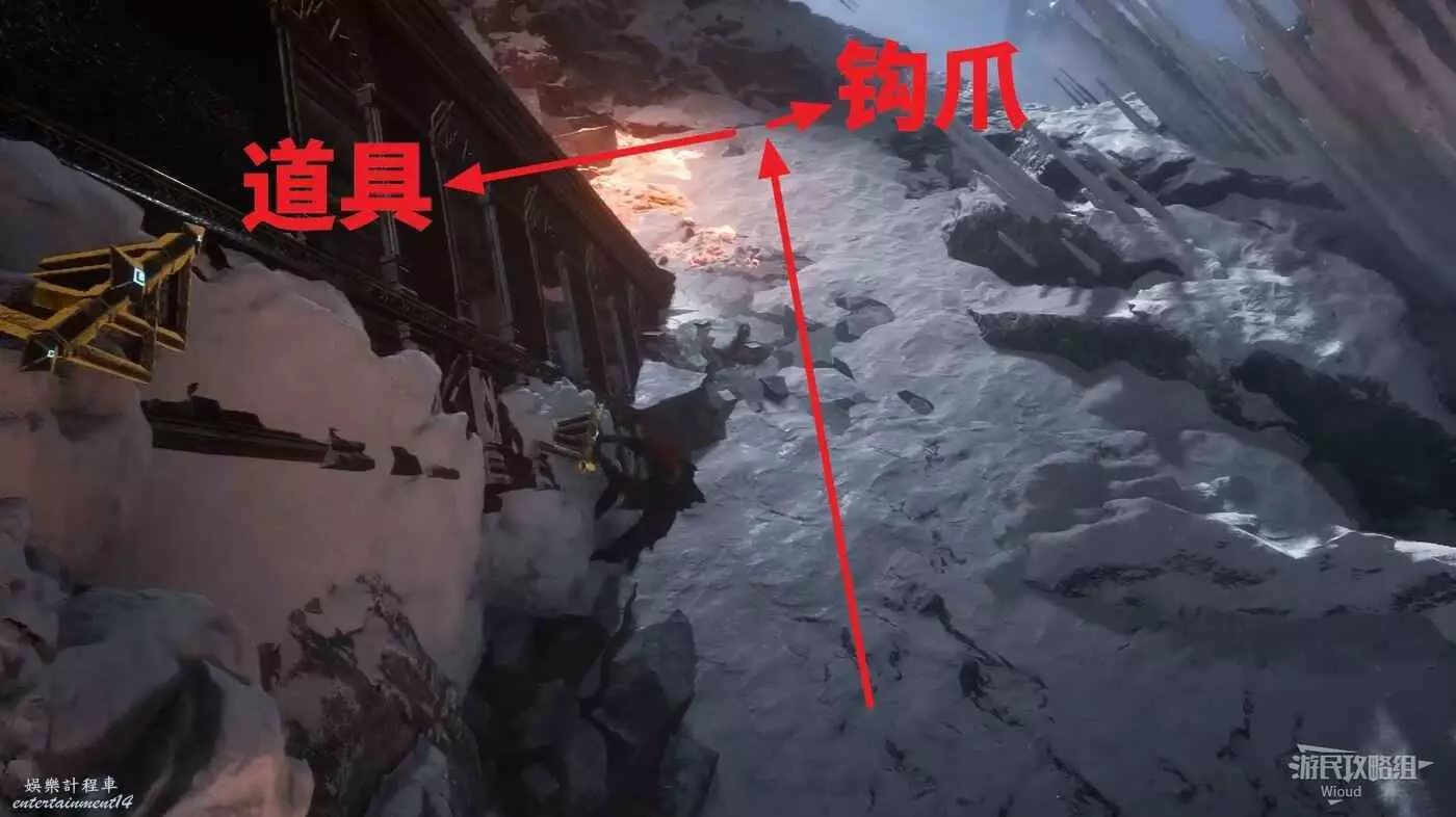 往左走,可以看到一個帶岔路的梯子,往上直走是主路,我們從梯子中間往右走,落地後往左繞可撿到一個強化道具,右側用鉤爪跳到車廂上回頭,啟動一個繩索。
