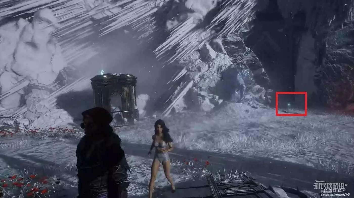 沿旗幟旁的軌道往前走,來到雪地往左後方繞,可在火車頭的位置撿一個【靈光色】。