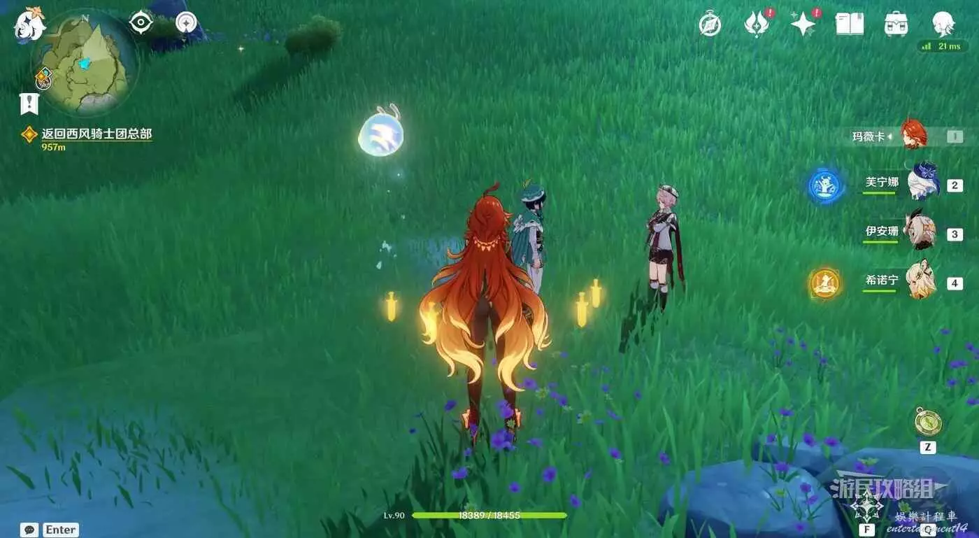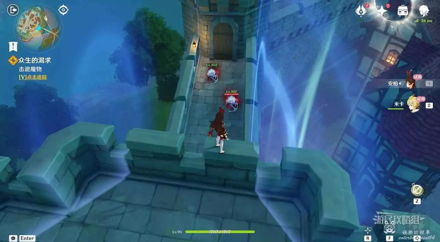 然後切換到安柏和米卡的視角,擊敗兩撥丘丘弓箭手,自動觸發對話。