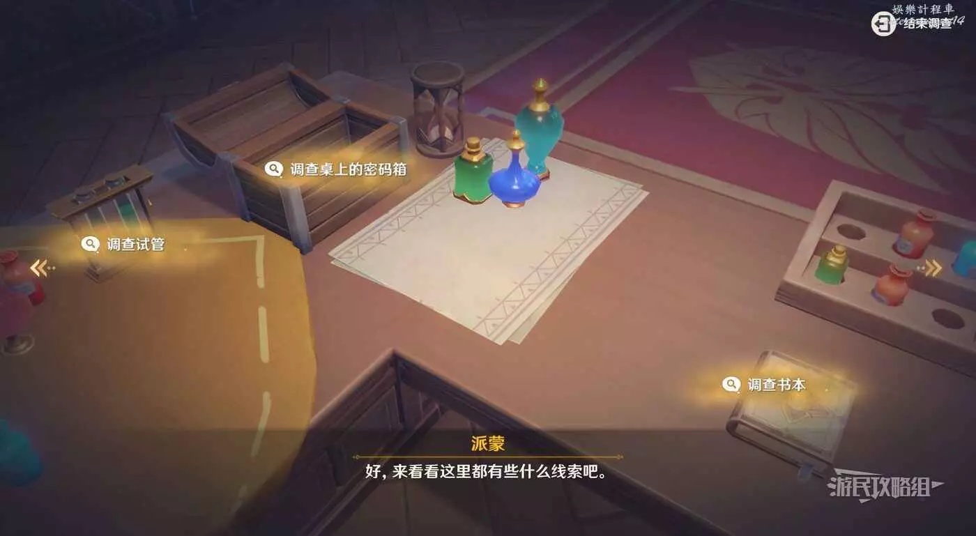 進入調查模式後,左右拖動視角,最初總共有三個調查選項,【調查試管】、【調查桌上的密碼箱】、【調查書本】。