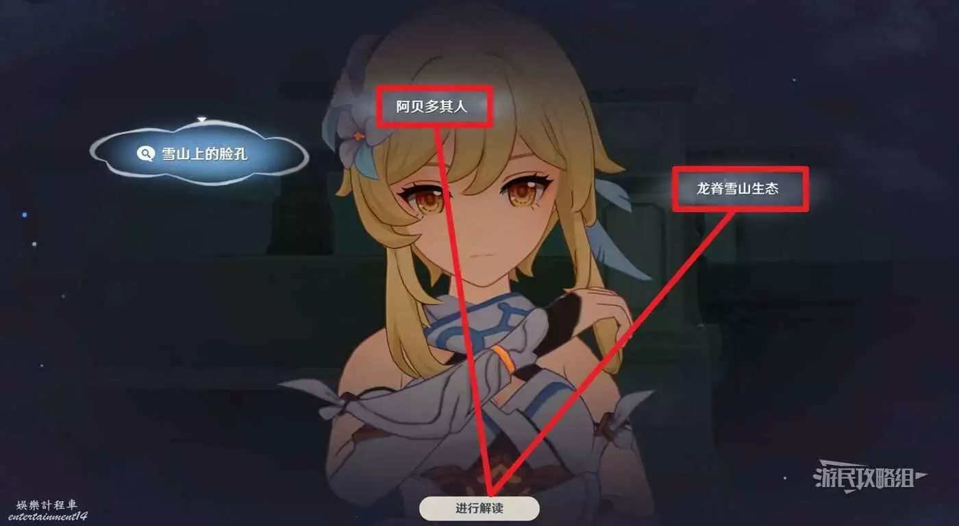 繼續推理,選擇【阿貝多其人】進行解讀,然後與【龍脊雪山生態】觸發聯想,獲得新線索【雪山上的臉孔】,提交結論。