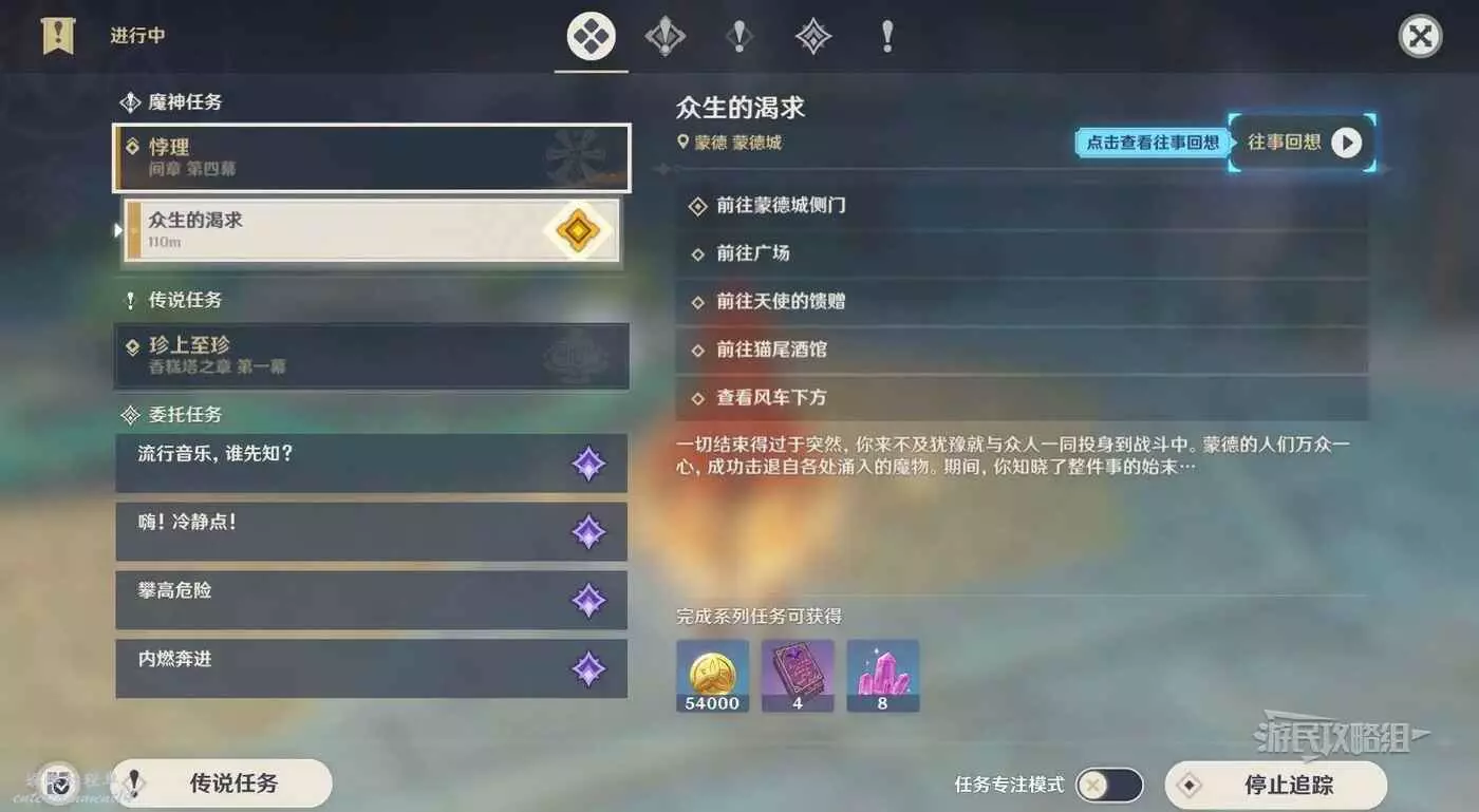 將遊戲內時間調整至兩天后,傳送到蒙德城,前往廣場進入劇情模式,看完劇情後任務完成。