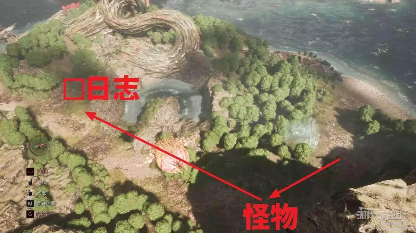 回到大地圖,入口位置沿著下圖路線走一段,中間怪物的位置可獲得武器【陶紋結】,箭頭所示日誌位置可撿到【64號遠征隊日誌】。