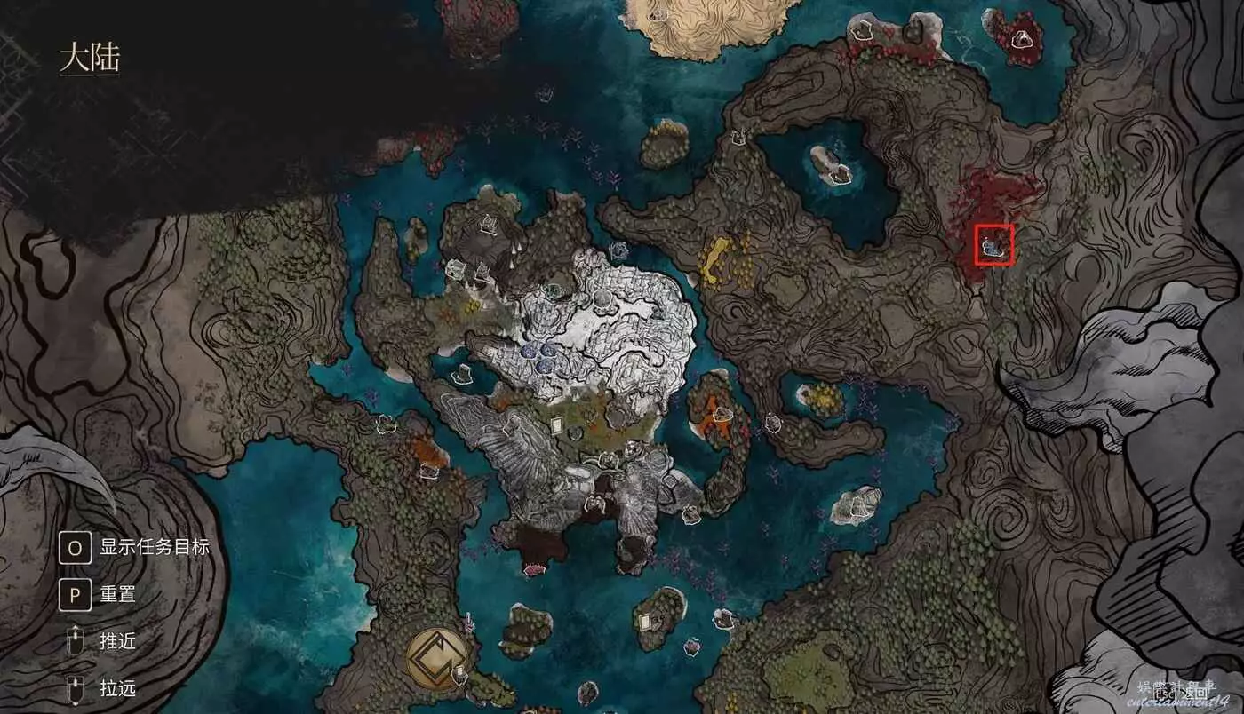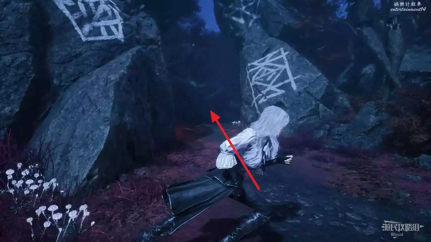 然後走巍民經怪左側岔路的最左邊道路走到一個開闊區域,這裡貼著左牆找到第一個凹口,裡面有【靈光色】可拿。