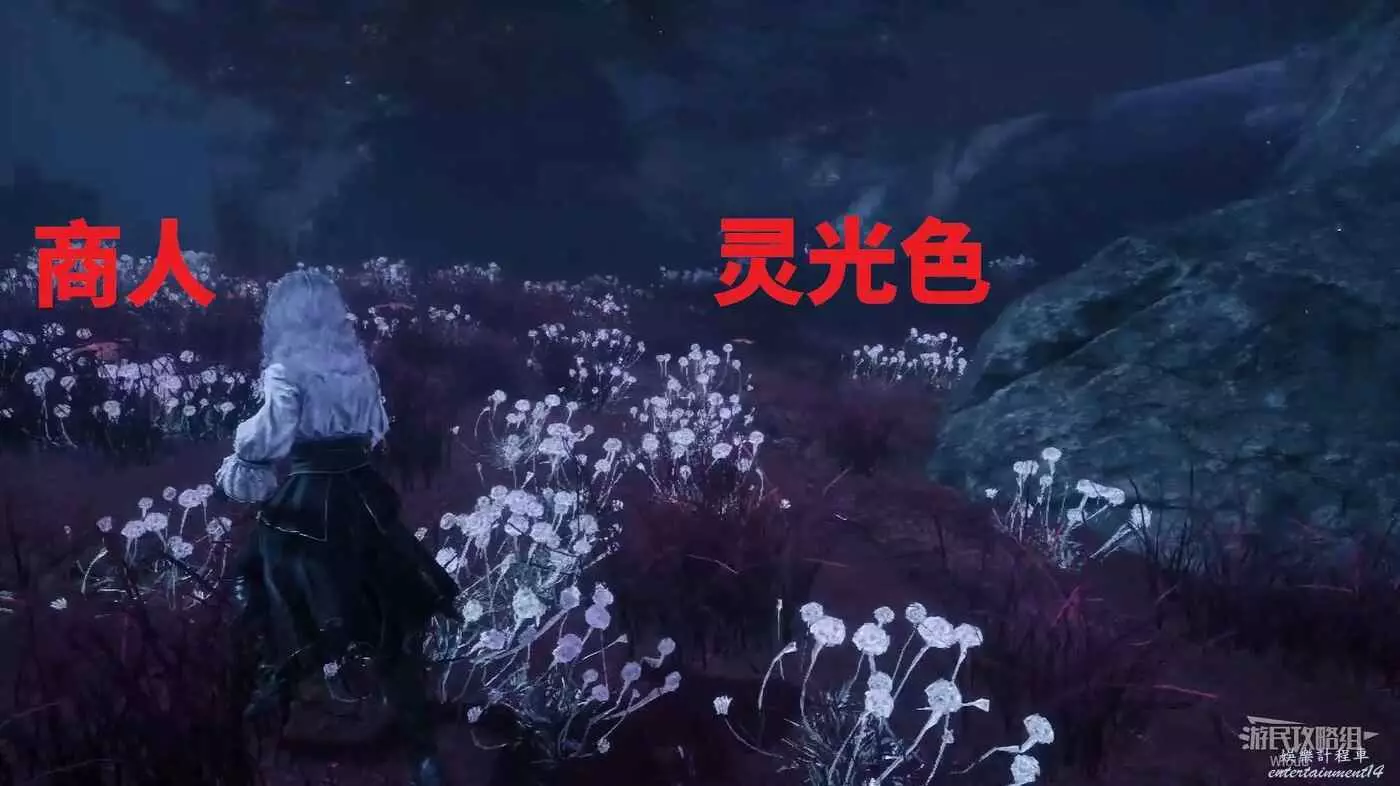 通過旁邊台階上去,右側有【靈光色】可拿,直走右拐找到一個商人。