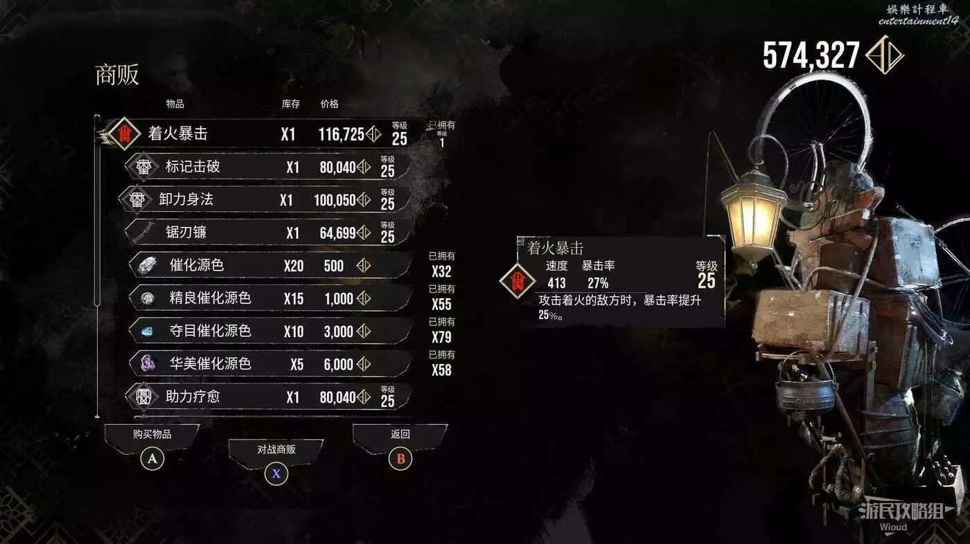 此處可購買符紋【標記擊破】、【卸力身法】、【助力療愈】、【助力護盾】、【防護攻擊】、【蓄能標記】、【提速亮色】、武器【鋸刃鐮】與裝束【便裝】。