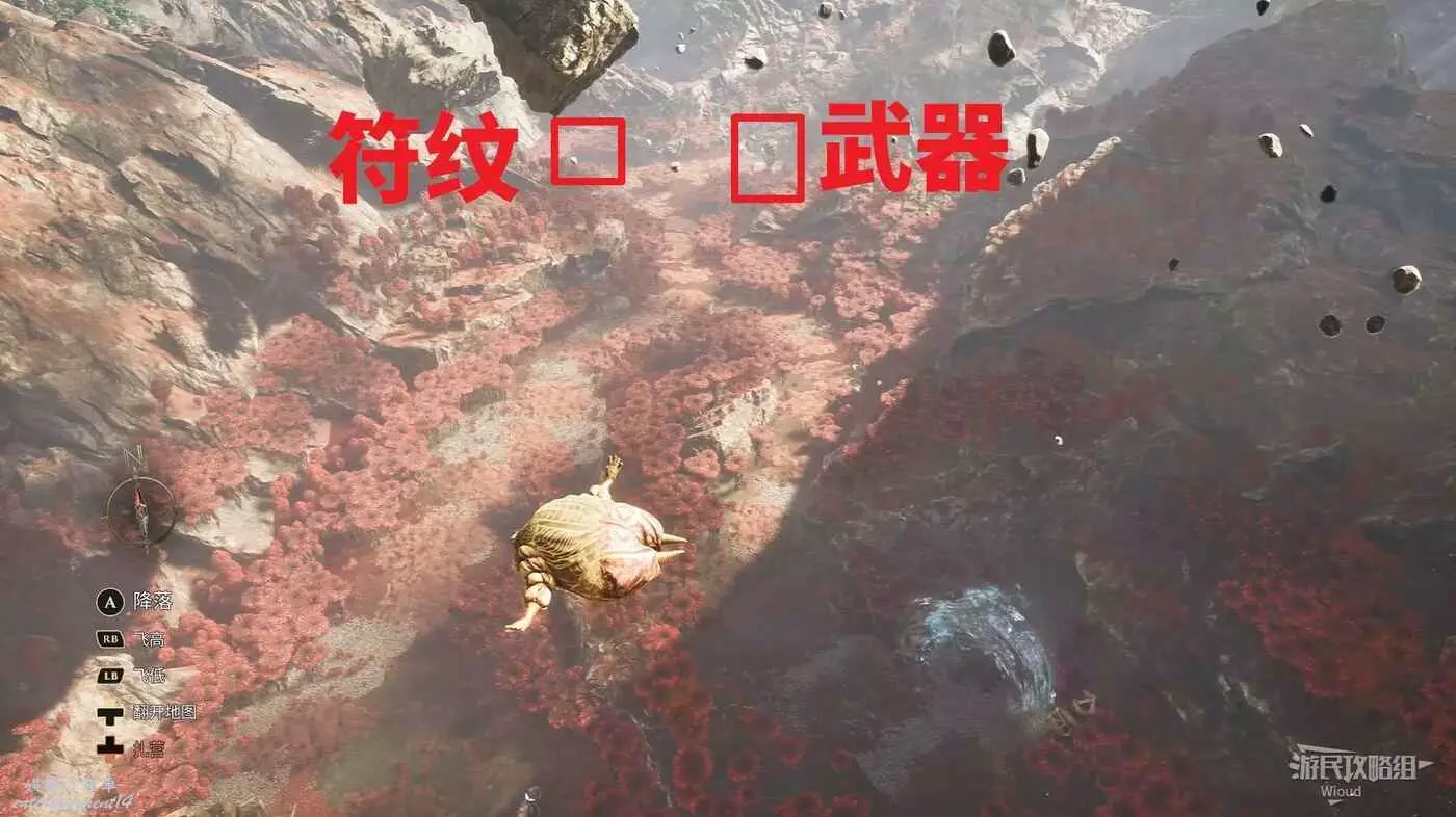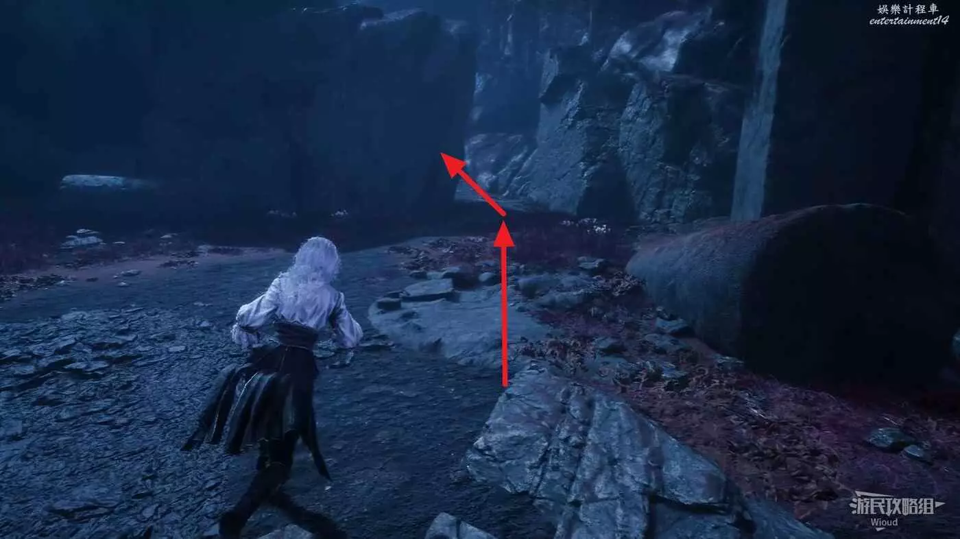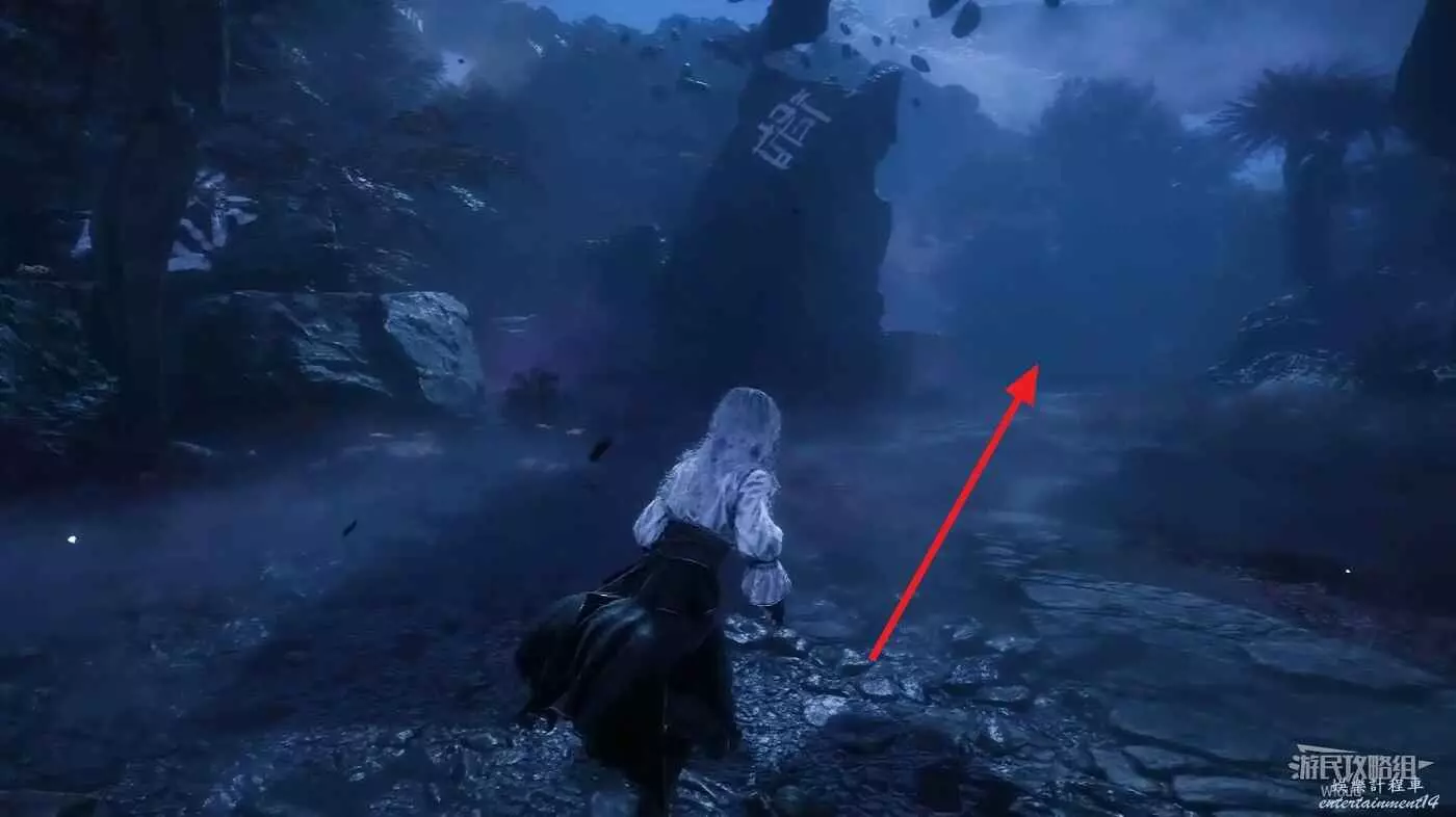 擊敗一個巨大敵人跟隨下圖箭頭所示位置走到頭,跳到底部有【靈光色】可拿。