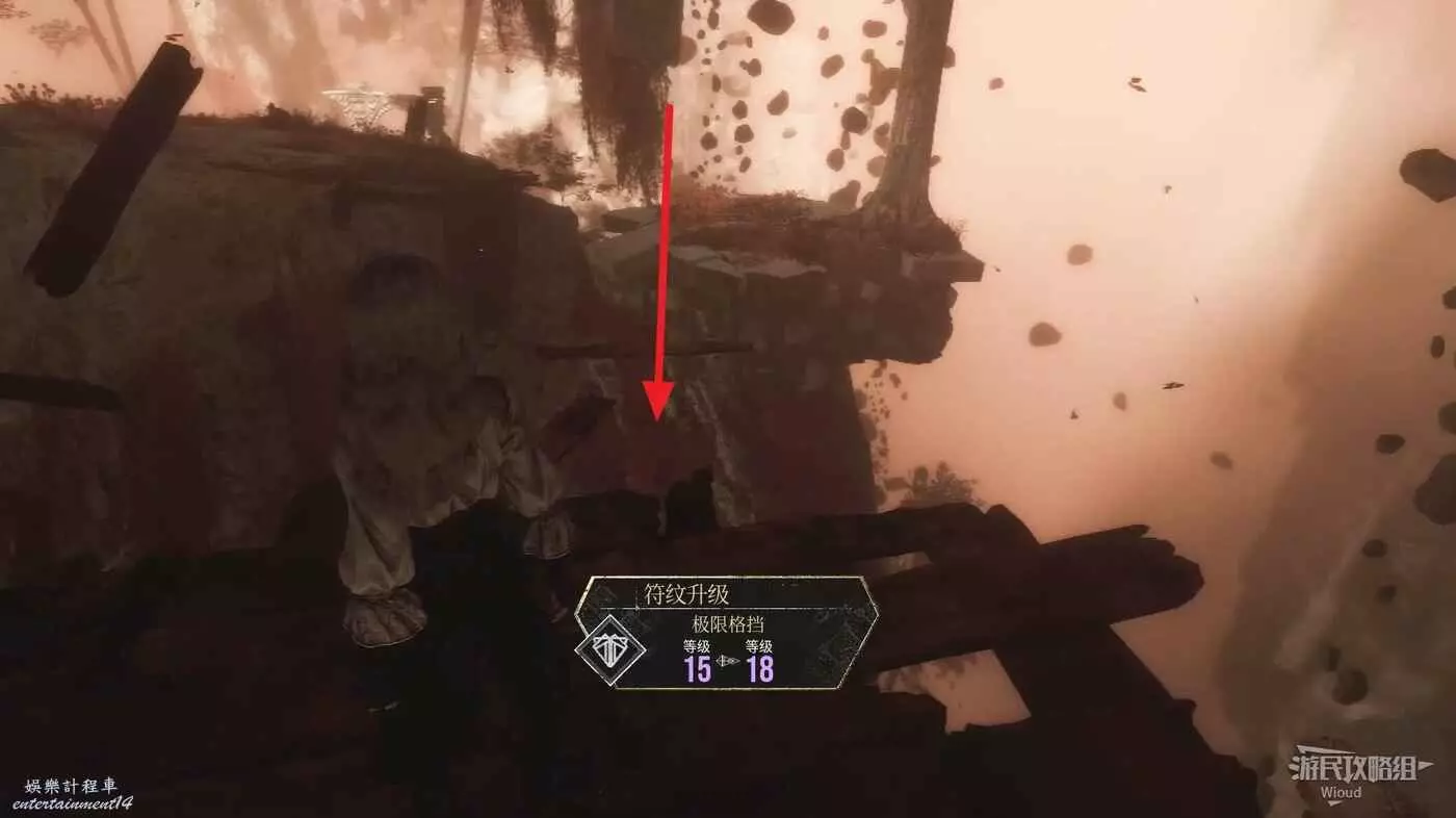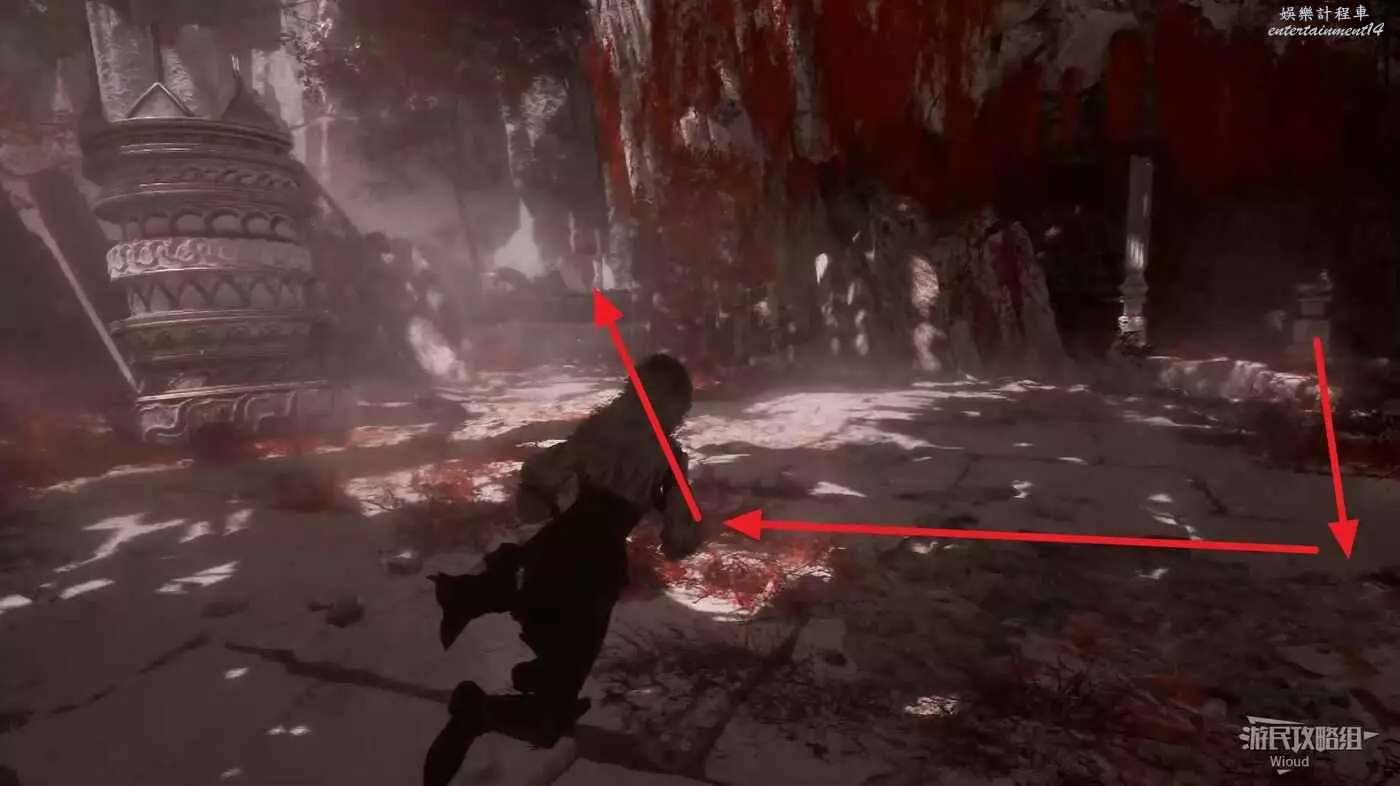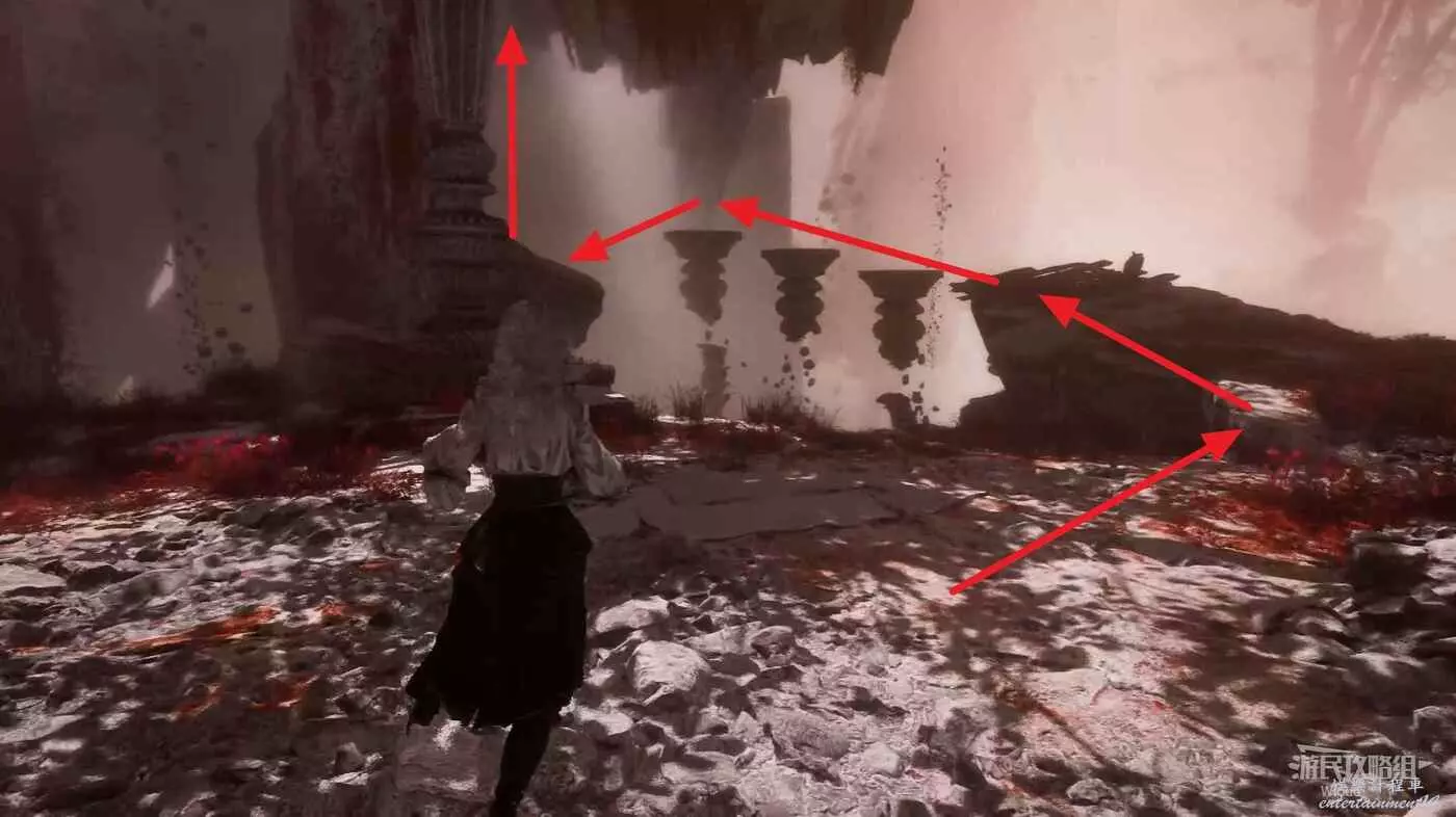 最底部右側有個【靈光色】可撿,然後沿著下圖箭頭所示跳到前方左側的平台,爬牆上梯子上去,再跳到旁邊的平台爬繩索到頂層。