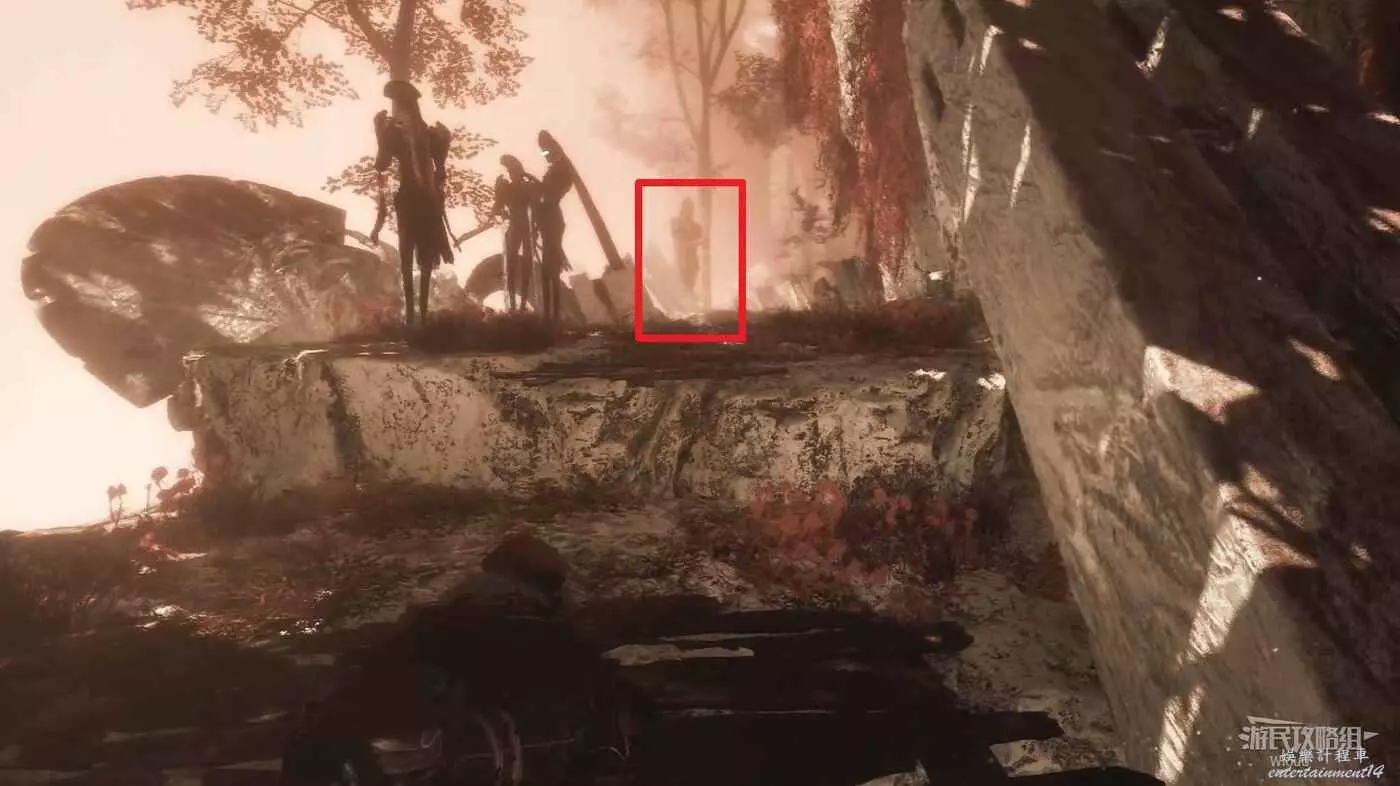 啟動開闊區域旗幟【三劍合璧】時往右後方繞,有個可以跳上去的平台,前方找到一個紅色雕像,與其互動將其啟動,我們還需要找到兩個雕像完成解謎。