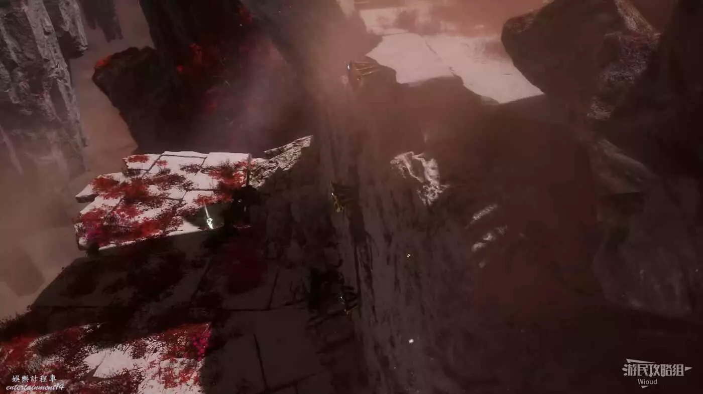 進入緋紅森林先沿著前方圓盤跳到對面平台,往前走的時候,左側有個缺口。