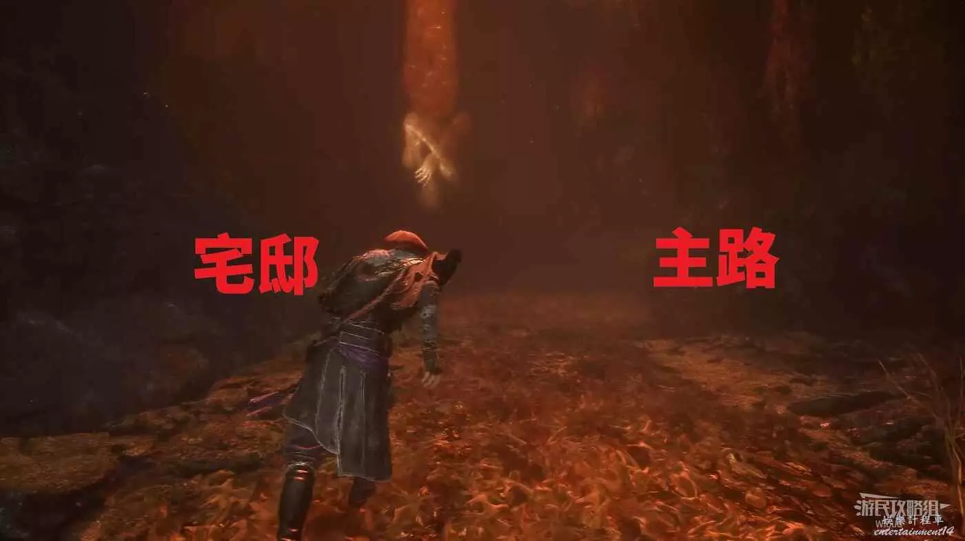 回到倒掛人位置,往右沿路一直走,直到跳下一個過道遇到一個巨大敵人。
