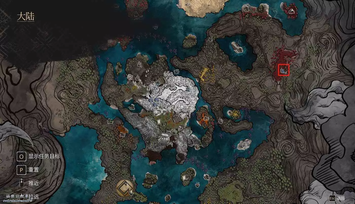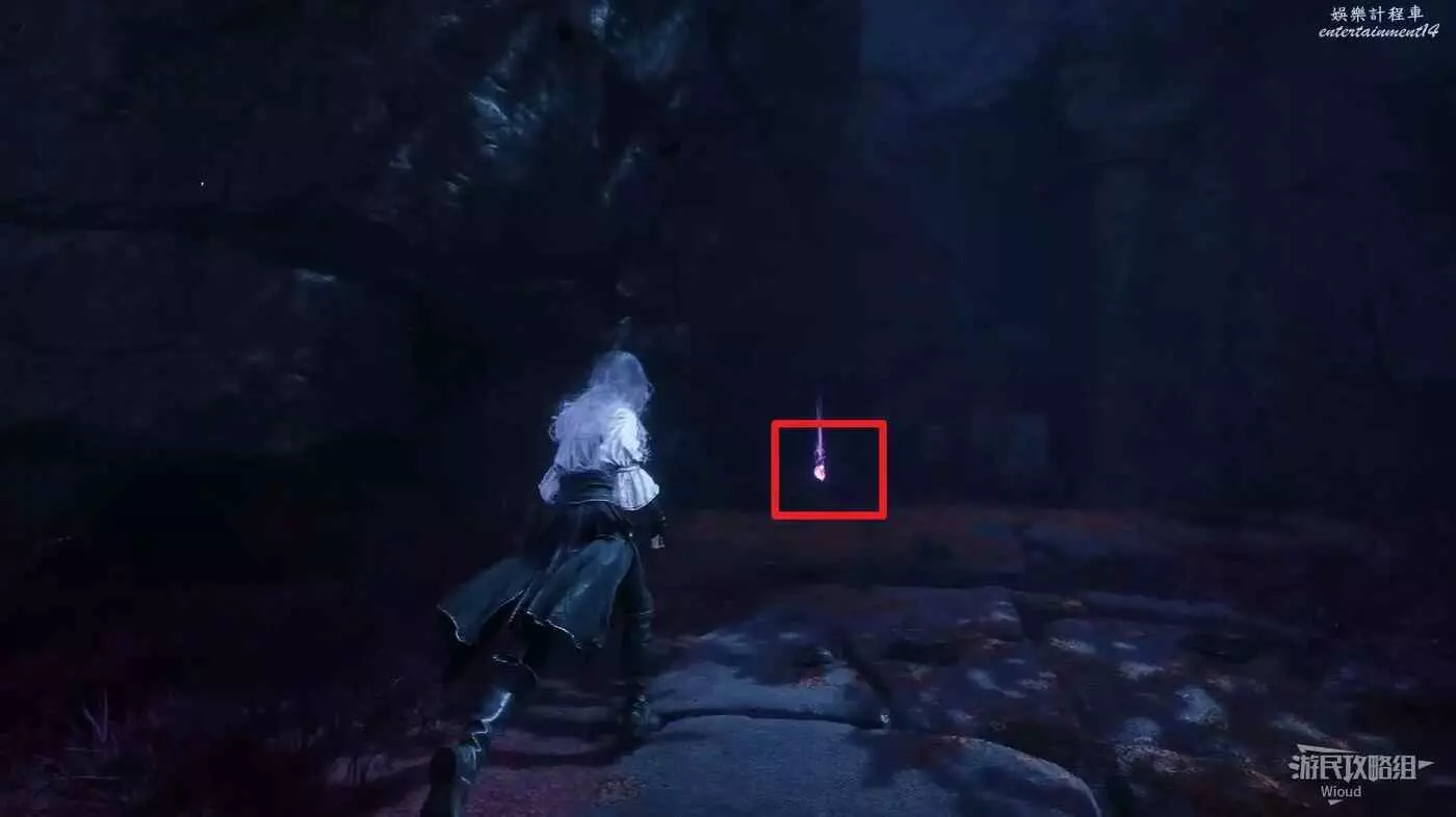 然後走巍民經怪左側岔路的最左邊道路走到一個開闊區域,這裡貼著左牆找到第一個凹口,裡面有【靈光色】可拿。