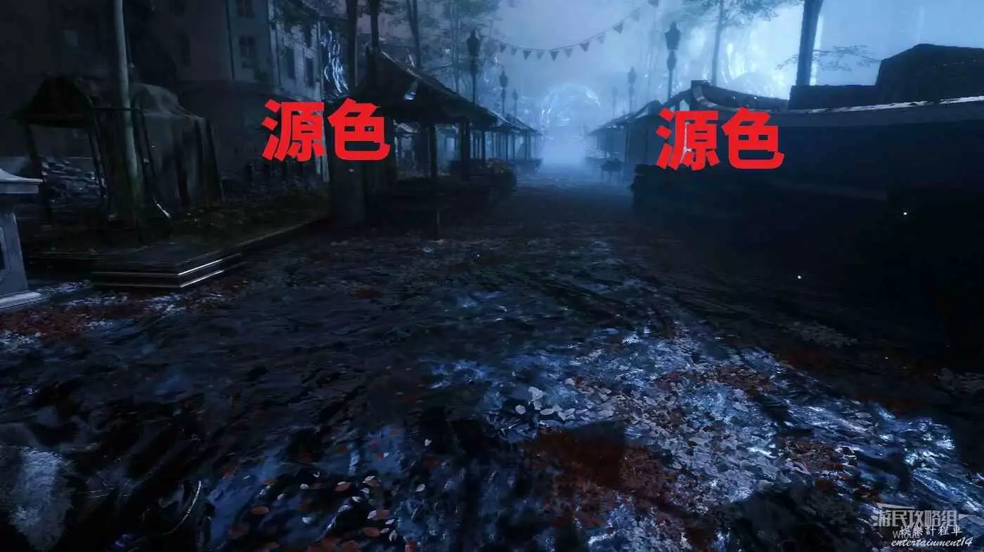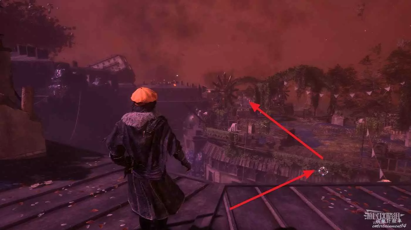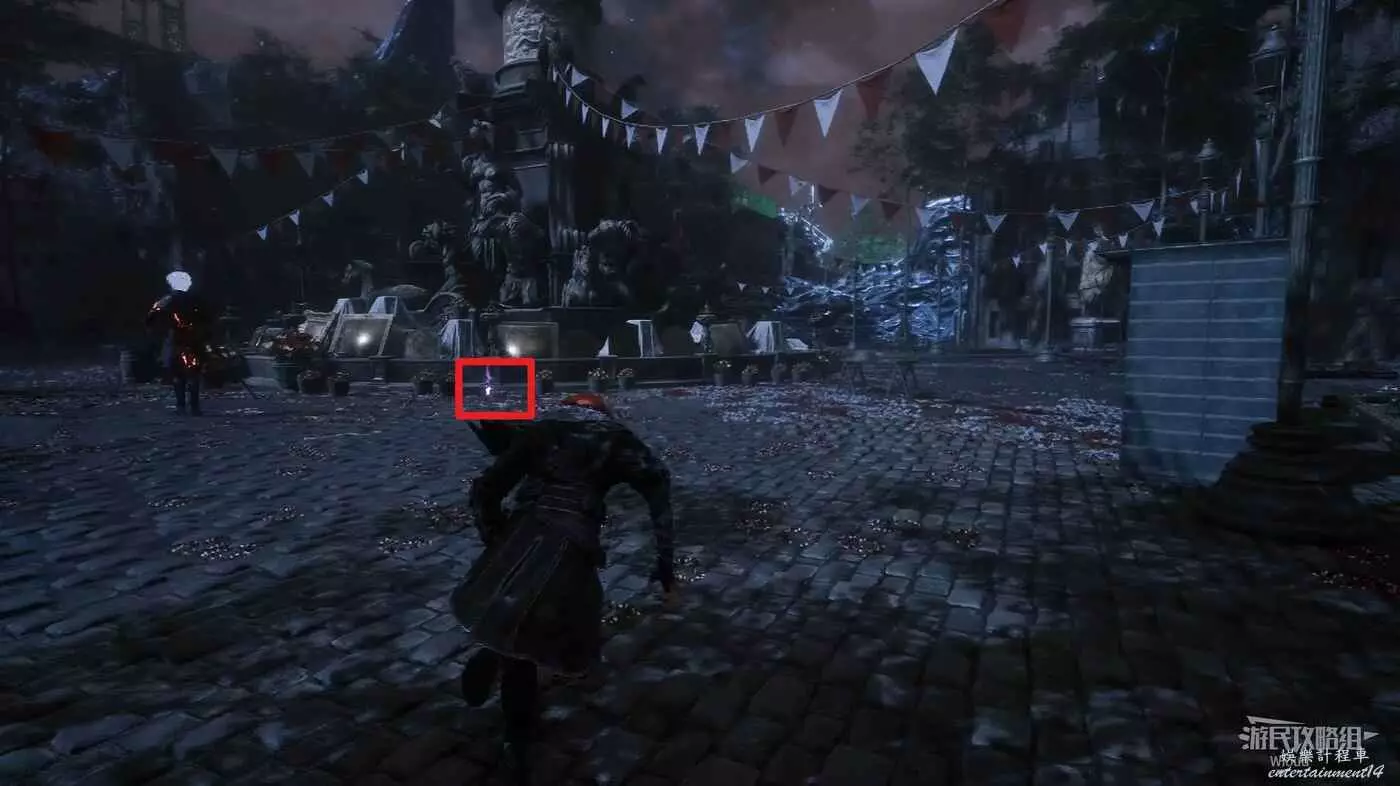 回到跳下來的位置,往左走,盡頭處可以找到一個靈光色,左側繞到中間噴泉的側後方,可在噴泉位置撿到一些道具。