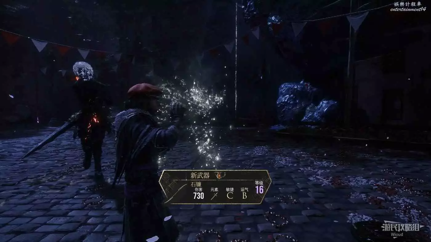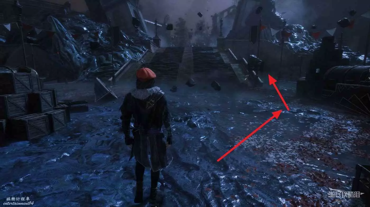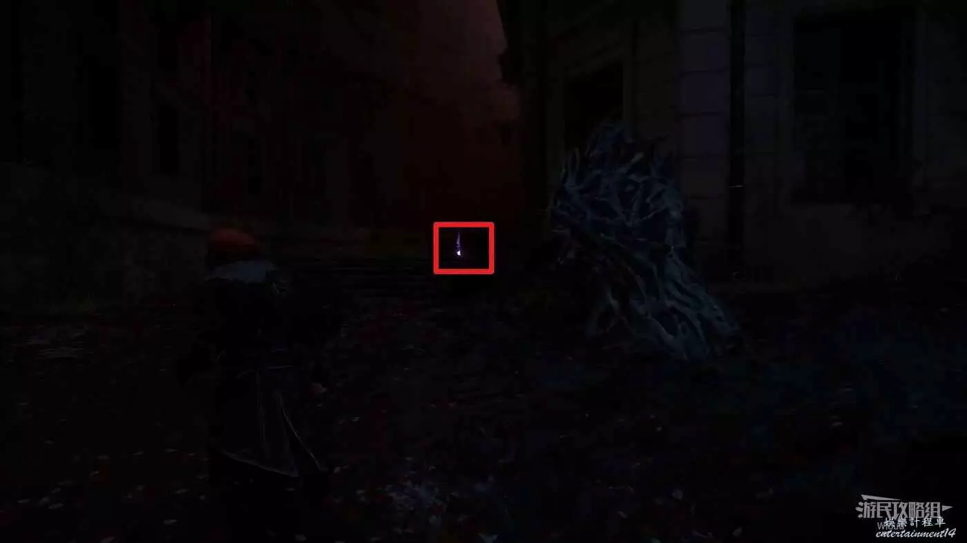 走噴泉後方主路,擊敗第一批敵人後,右側有個過道,裡面比較黑,可以撿到強化道具。