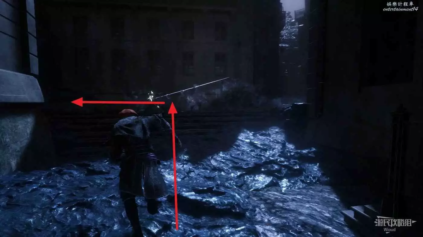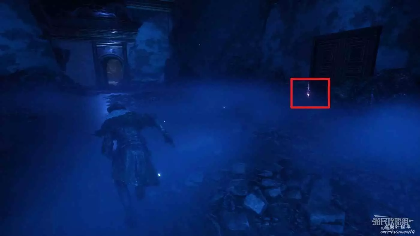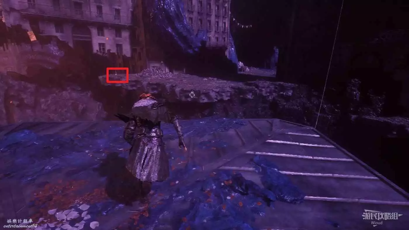 從精英怪後面的鉤爪跳到高處,上樓梯前左側可撿到一個【靈光色】。