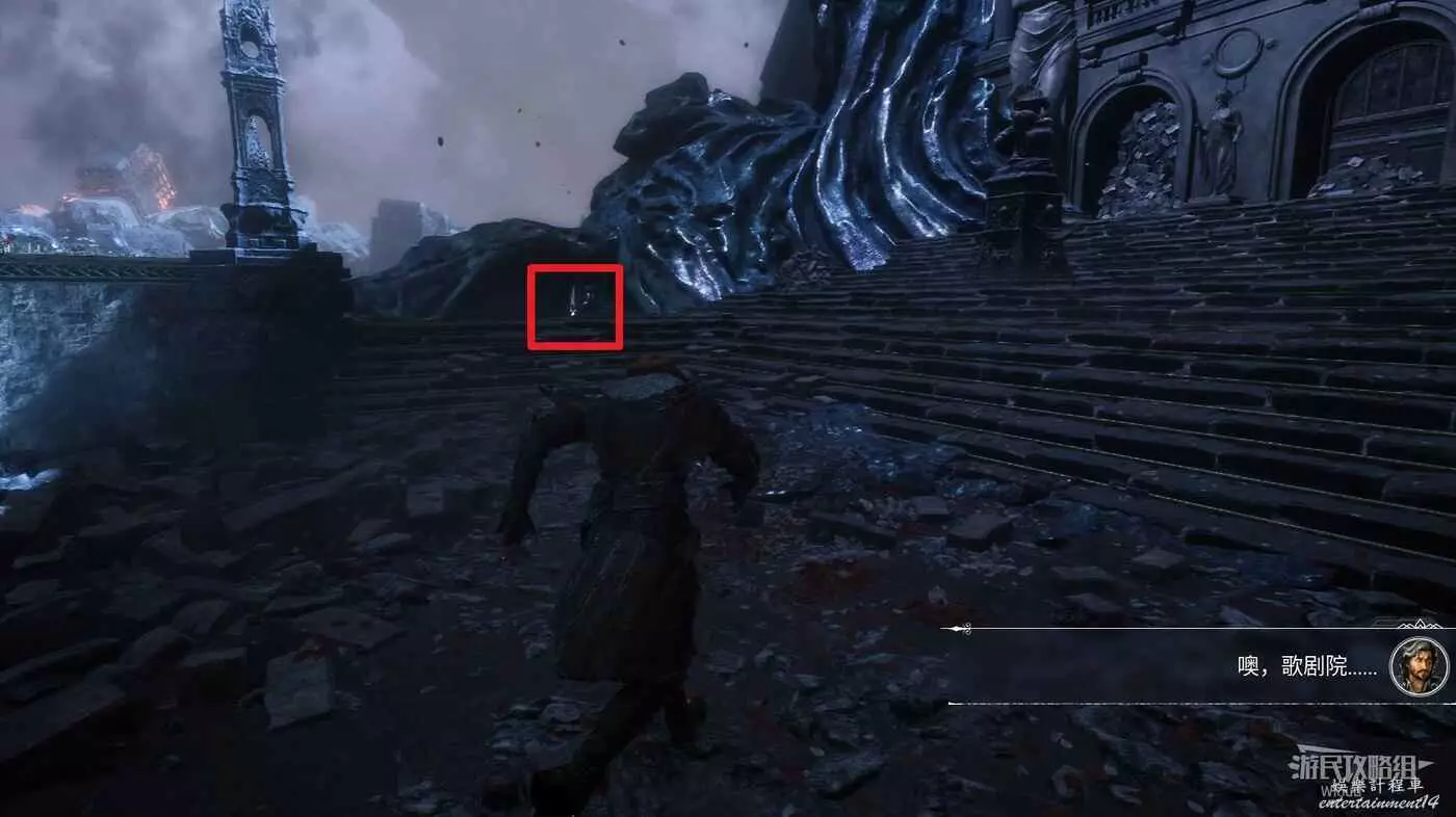 進入建築,沿著右側樓梯爬上去可撿到一個【靈光色】,裡面房間啟動旗幟【歌劇院】。