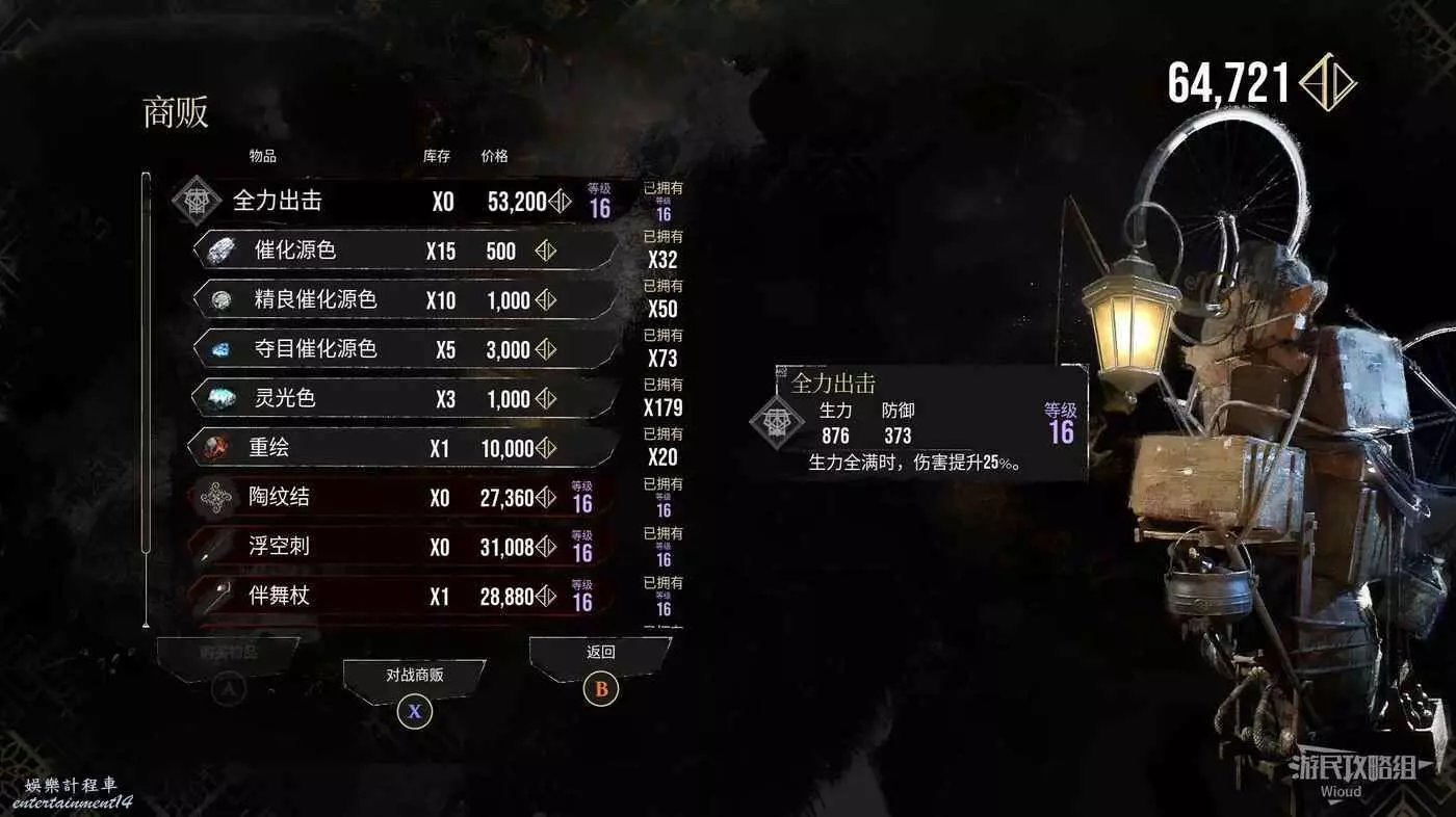 往裡走,左側蓋白布箱子的位置可撿到一些源色,前方找到一個商人,可購買符紋【全力出擊】,武器【陶文結】、【浮空刺】。