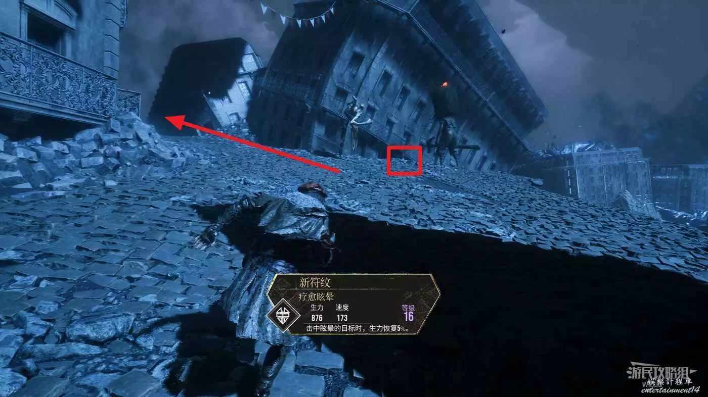怪物位置往左走,可撿到一些強化道具,往右走到拐角處,擊敗擊敗怪物可提升伴舞杖的等級,怪物旁的藍點可撿到符紋【療愈眩暈】。