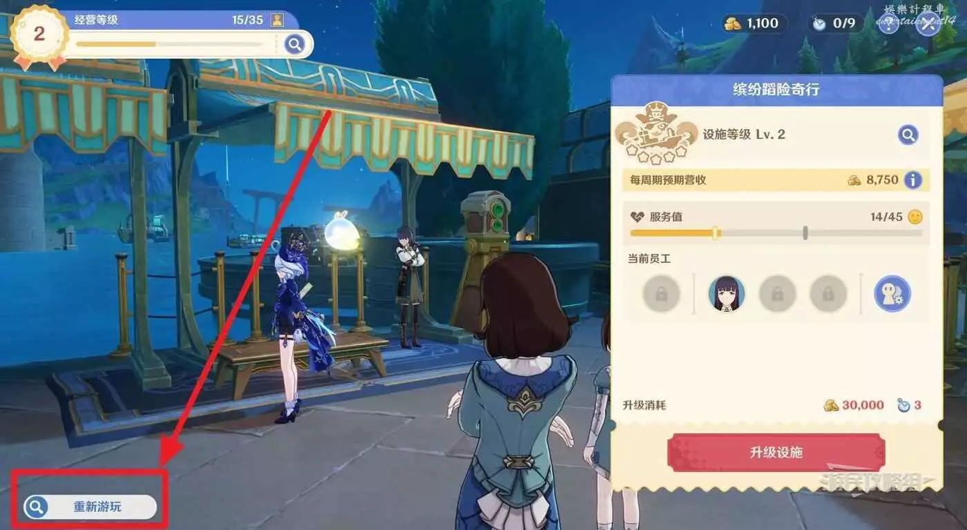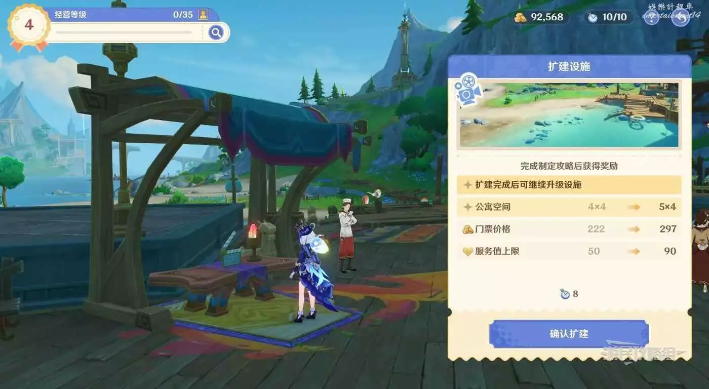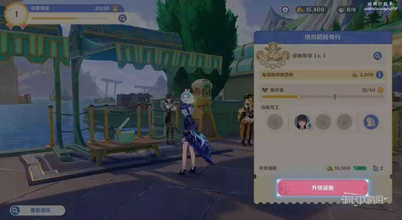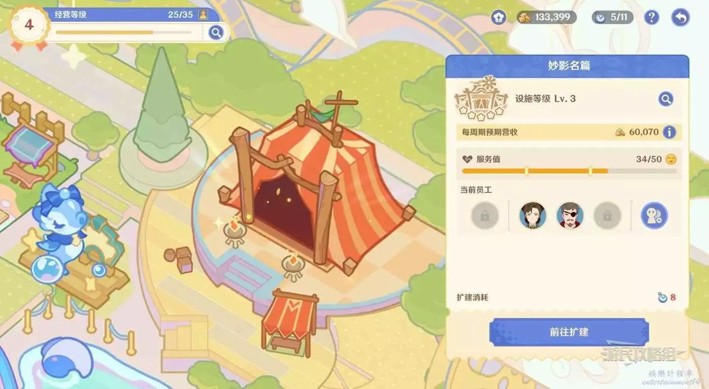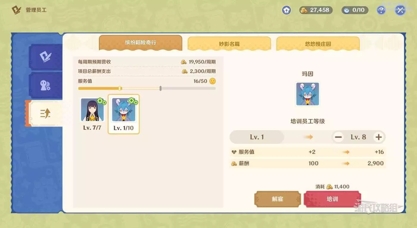 然後升級設施,筆者這裡升級了【悠悠慢莊園】和【繽紛蹈險奇行】。所以需要為這兩處設施搭配新的員工,並且將員工培養至滿足下一個服務階段。