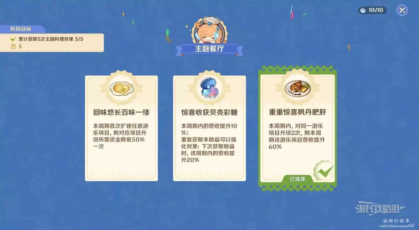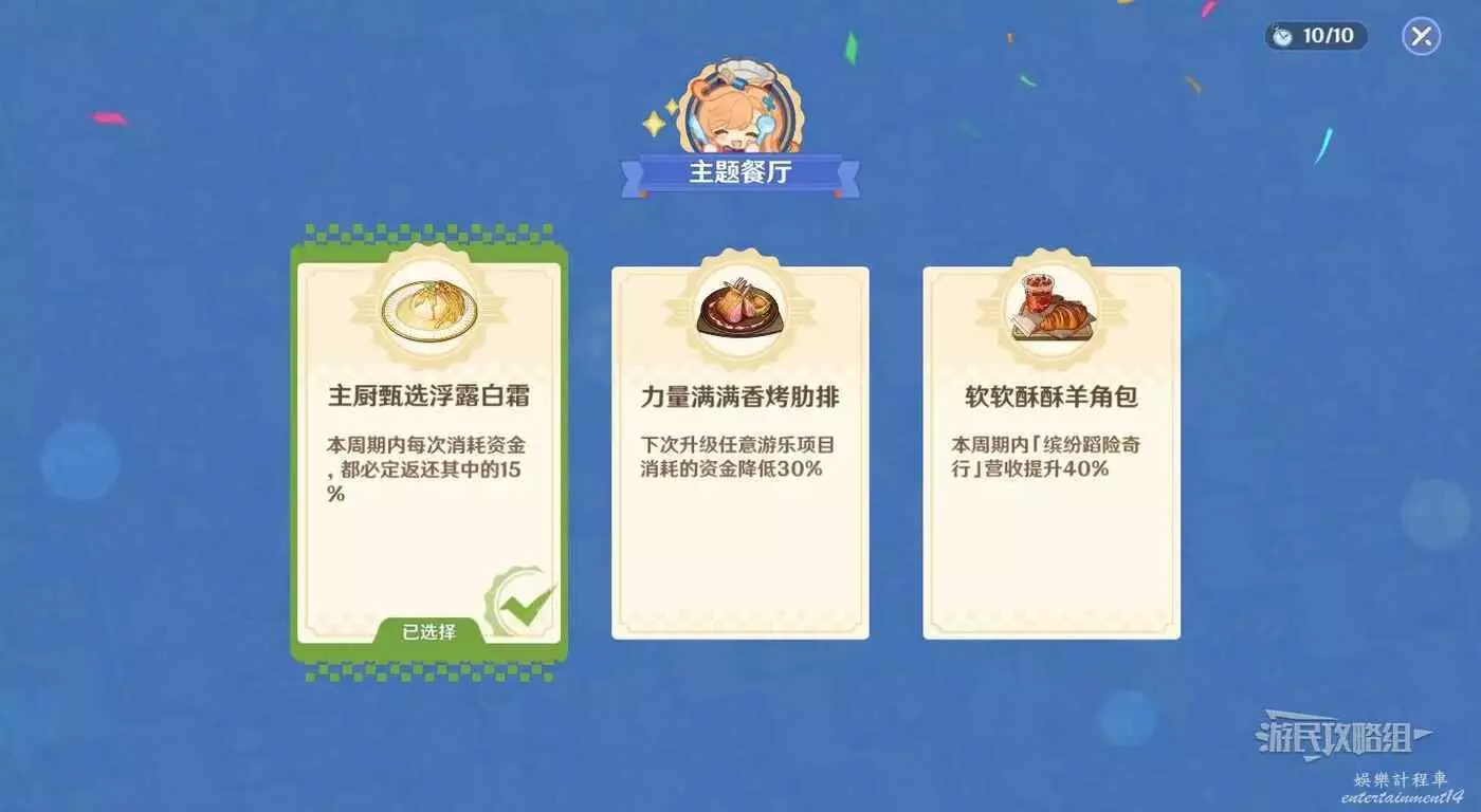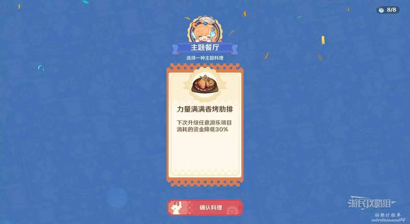 然後去找愛可菲挑選料理,由於料理出現為隨機,所以建議根據所選料理的效果再進行本週期的管理。例如選擇了員工升級消耗降低,那麼就在料理生效期間培養員工,以免過多浪費。