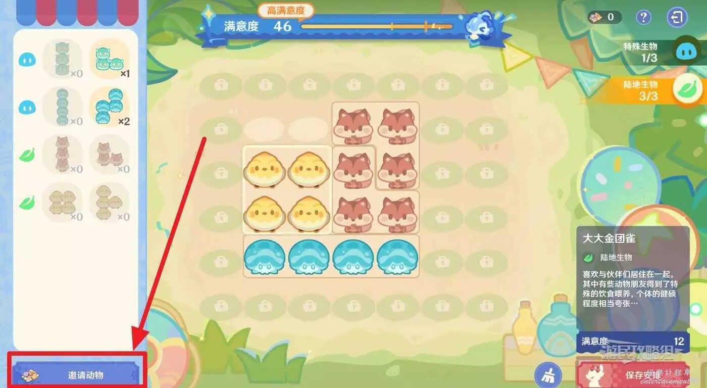 解鎖【悠悠慢莊園】,邀請並安排動物,參考下圖,優先安排同類的生物以啟動特殊效果。