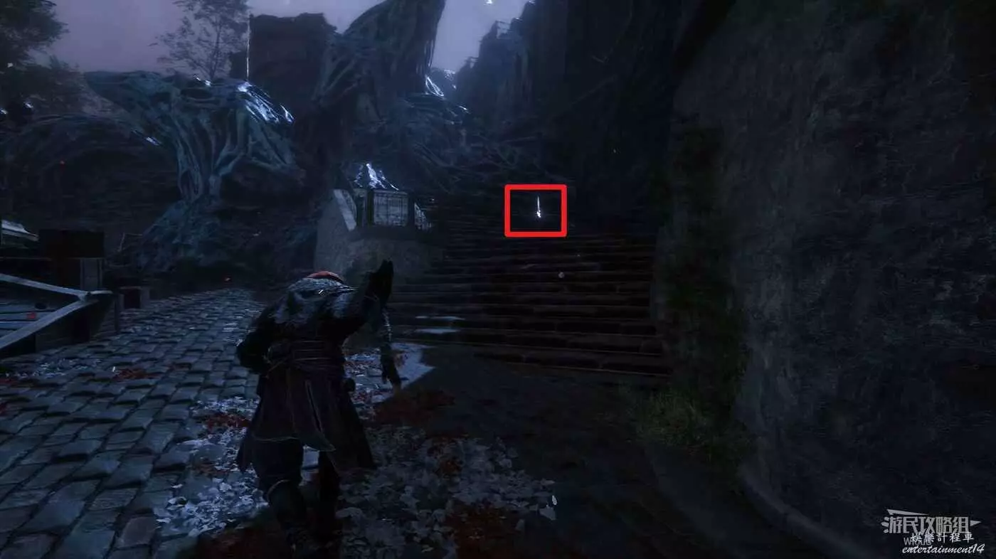 走噴泉後方主路,擊敗第一批敵人後,右側有個過道,裡面比較黑,可以撿到強化道具。