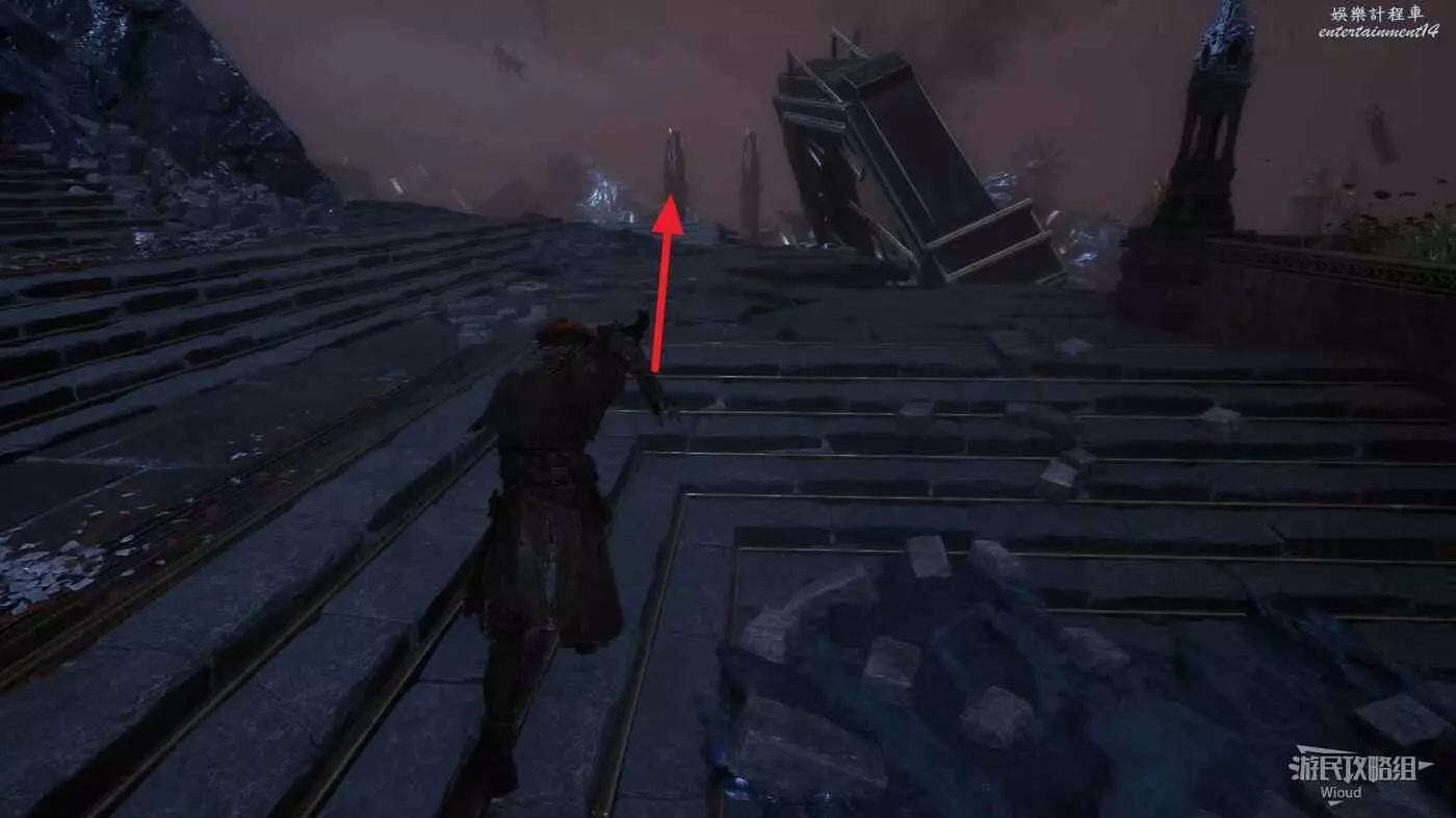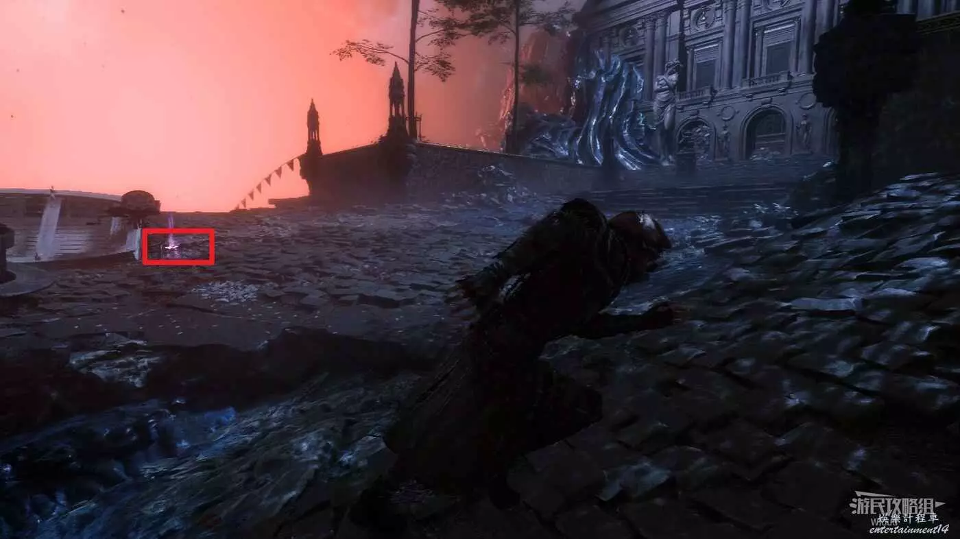 從精英怪後面的鉤爪跳到高處,上樓梯前左側可撿到一個【靈光色】。