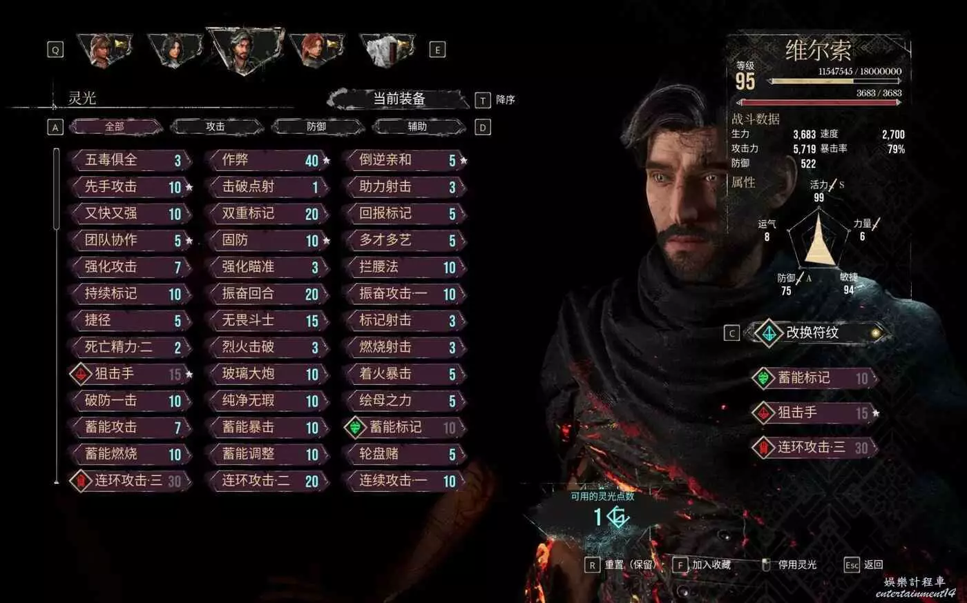 呂涅:副c,擊破工具人。技能點出 著火、熱能轉化、狂殺、雷擊,武器用詭結。熱能轉化保證行動點,射擊出4球狂殺。“飛流域”敵人弱雷,而且還沒拿到詭結,雷擊耗1點出2個雷球,如果消耗火額外出個光明,也屬於點少產球手段