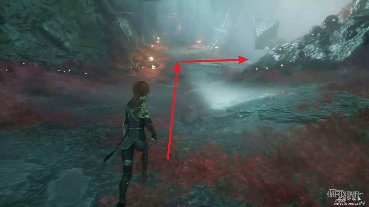 右側有個往下爬的梯子,直接無視,沿著下圖路線往左前方平台上跳。