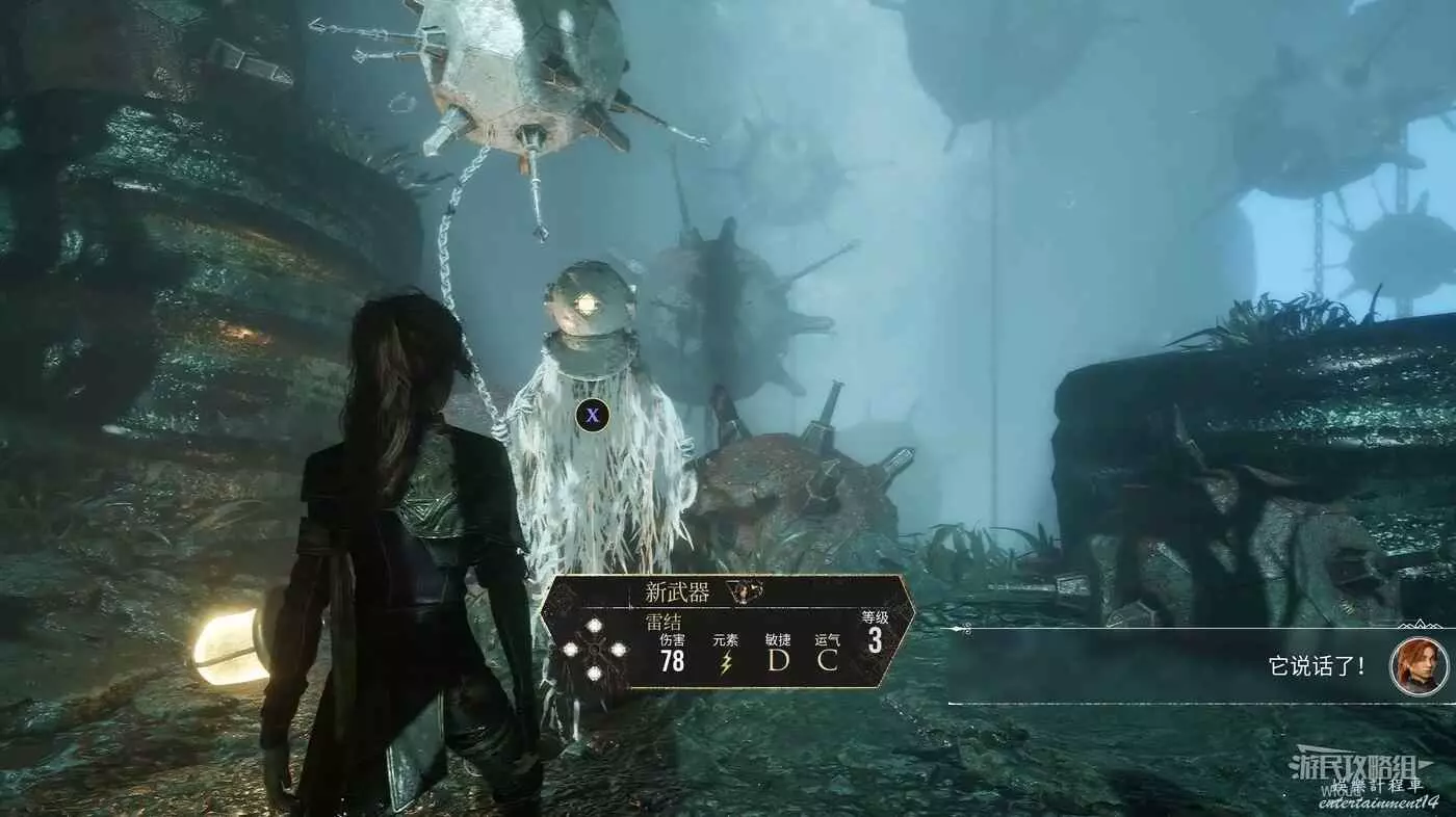 從對面出口回到剛才的開闊區域,通過壺口回到雷靈的位置,將剛才撿到的水雷交給它獲得武器【雷結】。