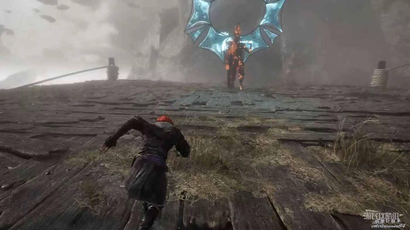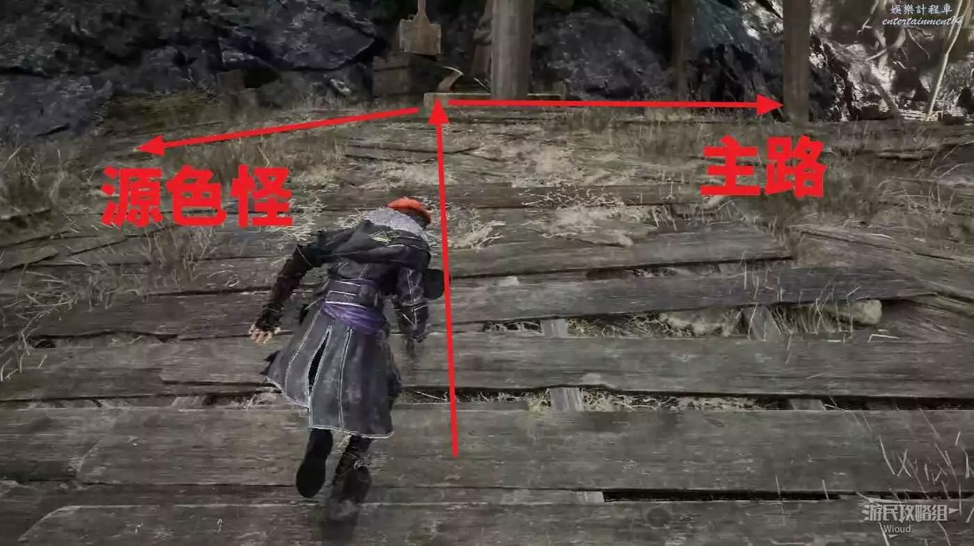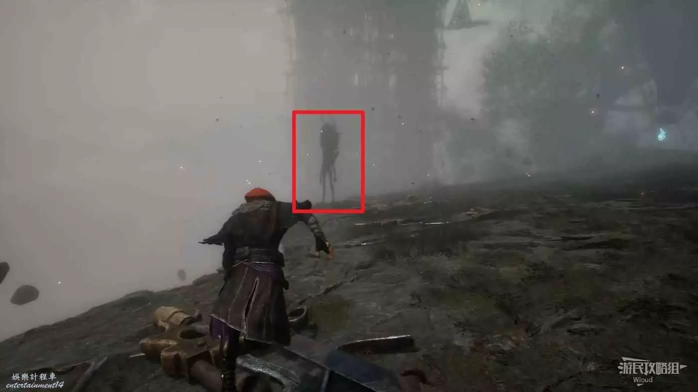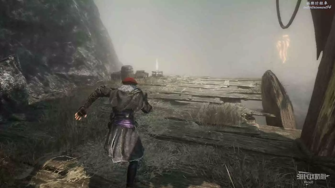 朝NPC右側的木橋走,直到通過一個長距離的鉤爪點,看到前方盡頭有倆怪物。