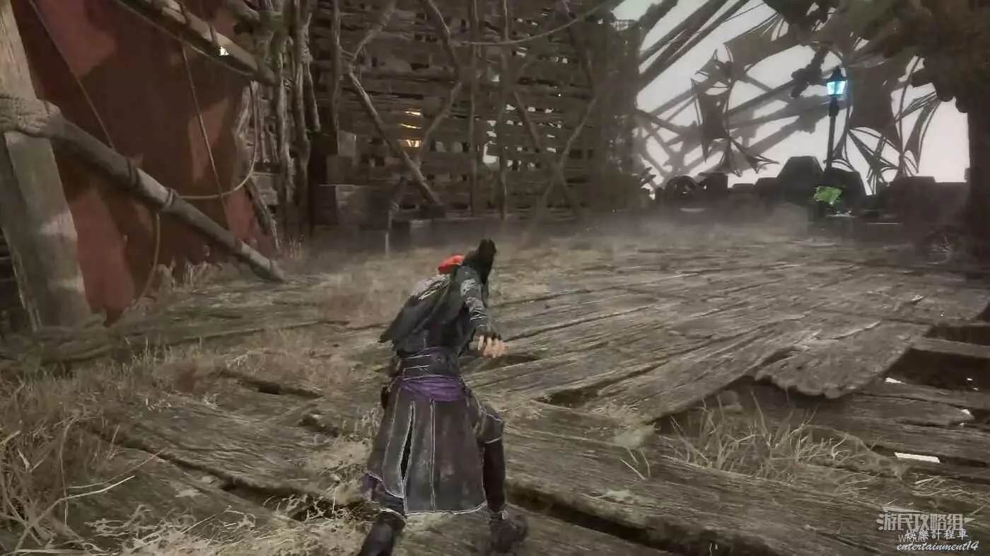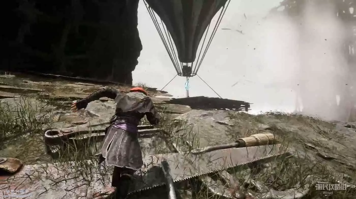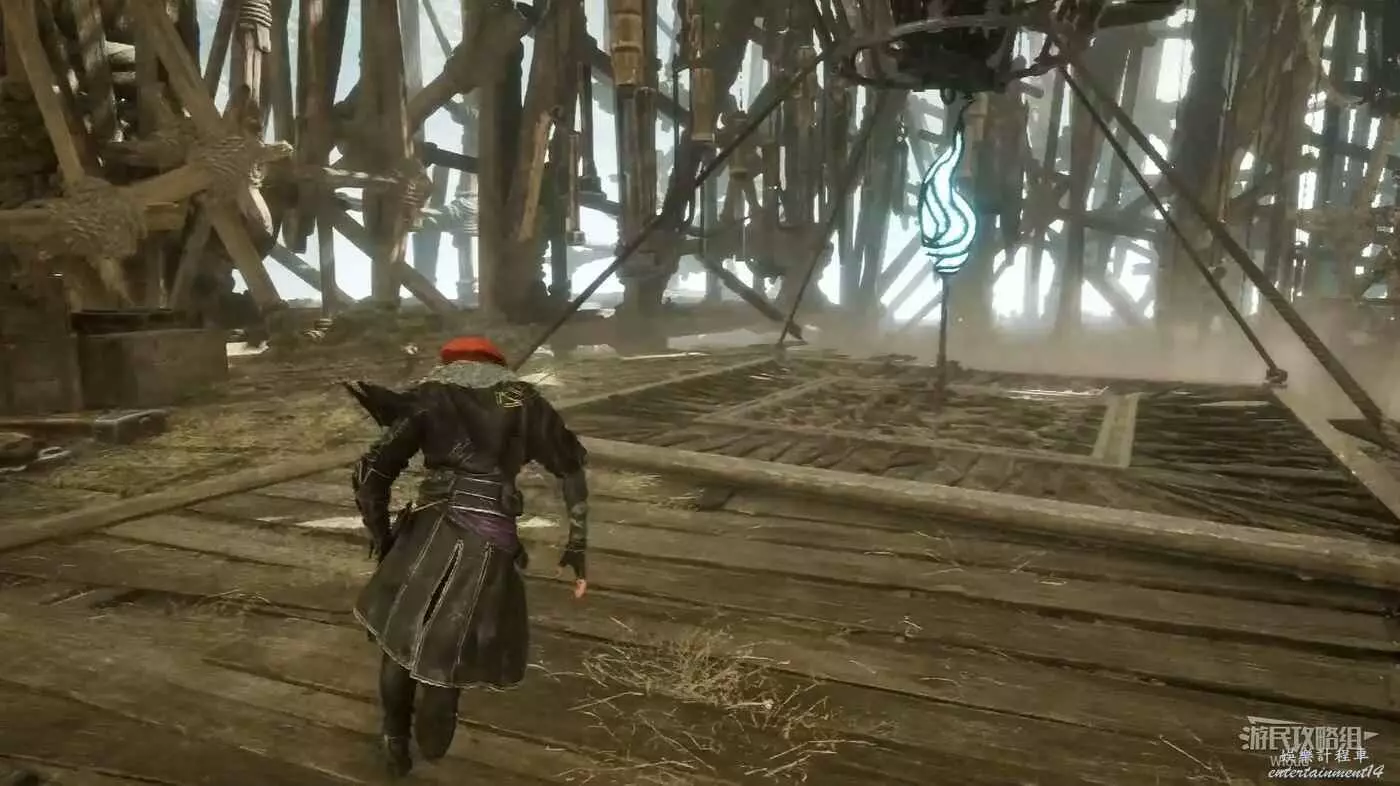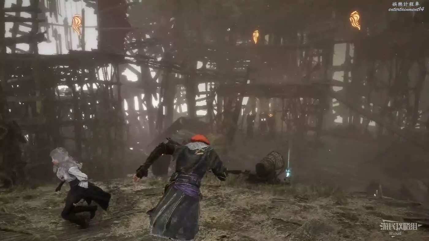朝NPC右側的木橋走,直到通過一個長距離的鉤爪點,看到前方盡頭有倆怪物。