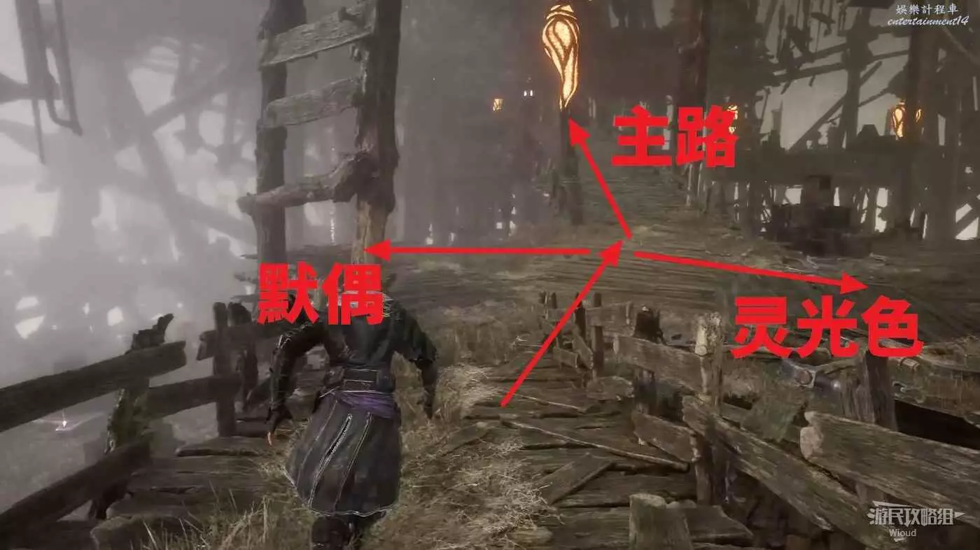 先啟動的第三個旗幟,前面走到一個十字路口,右側有【靈光色】可撿,左側沿繩索下去可找到本地圖的【默偶】與一個【靈光色】。