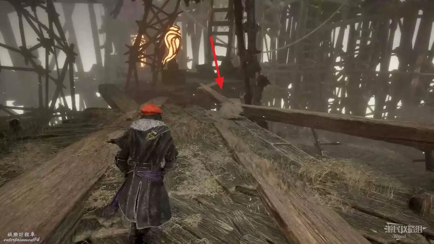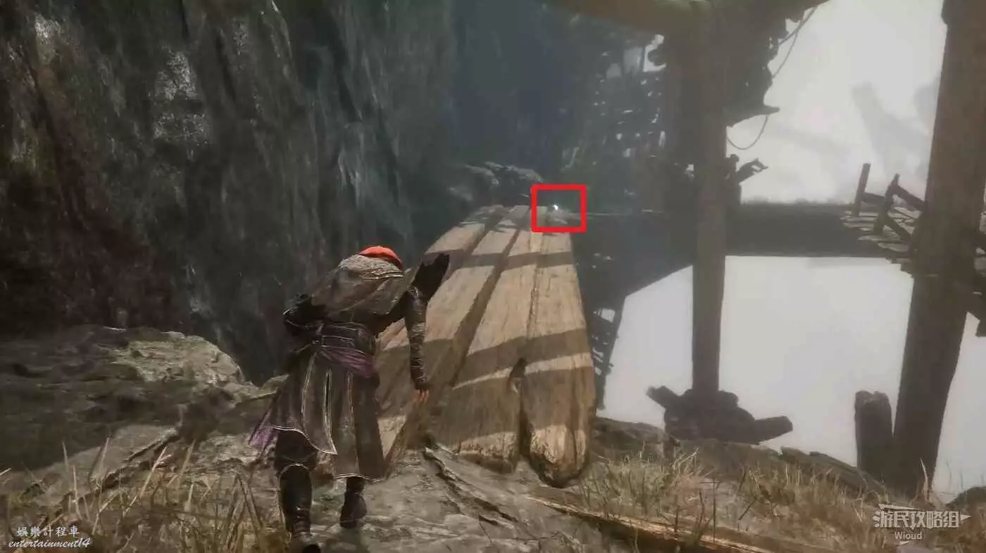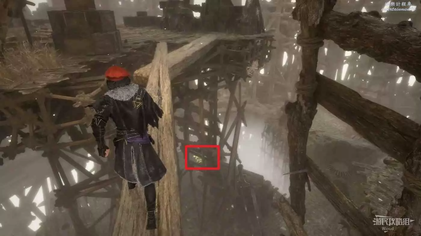 回到十字路口,沿主路做,直到看到一個獨木橋通道,從獨木橋中間跳到最底層。