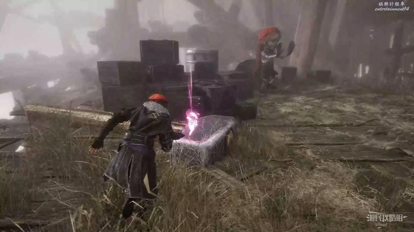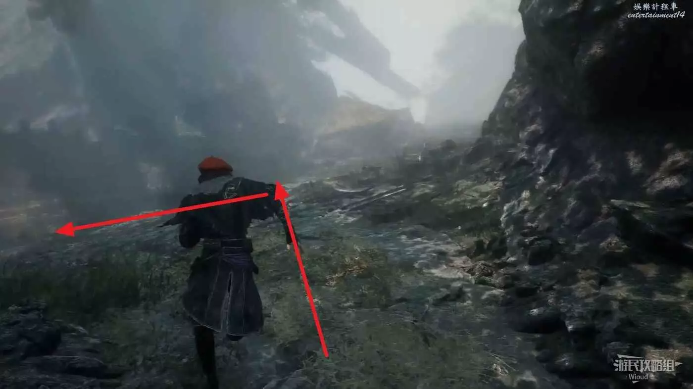 鉤爪登陸點左側有個狗洞,先拾取前方倆怪物中間的道具點獲得符紋【蓄能反擊】。