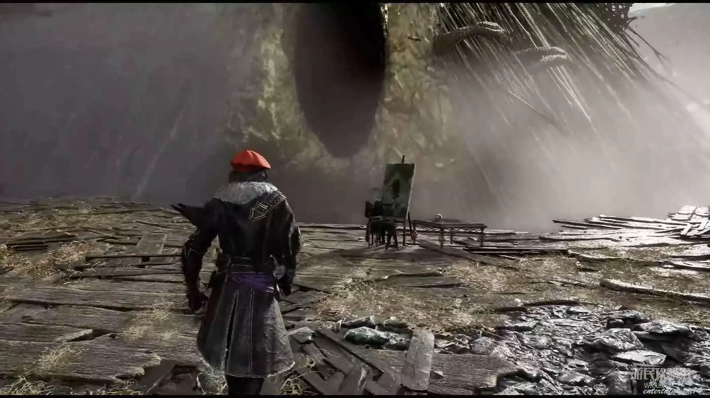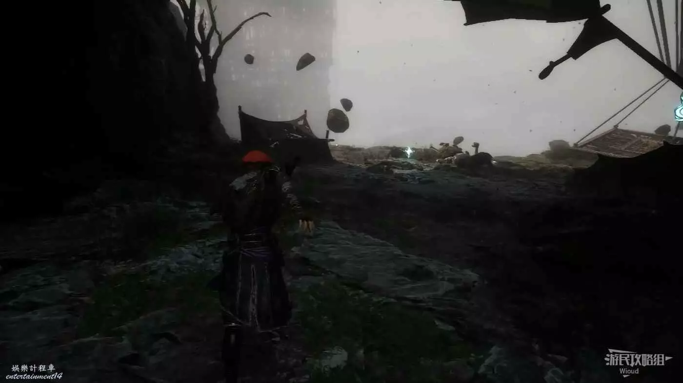 通過鉤爪移動到另一個地方,前方倆怪物右側平台有源色可撿,怪物左側懸崖處有個可對話的NPC。