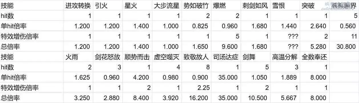 ——招式倍率只和造成傷害的手段有關,例如普攻固定為1,非弱點射擊固定為0.15。妹妹的部分技能倍率可參考下下圖2,其中單hit倍率指不觸發技能自帶增傷時完美QTE下的每hit平均倍率,部分技能(如致敬故人)的各hit倍率不同;特效增傷倍率指技能自帶的最大增傷效果,如熊熊畫界每層著火增加10%傷害,最大加成100層,因此最大倍率為1+10%*100=11;總倍率為單hit倍率*hit數*特效增傷倍率,方便比較各技能之間的效率