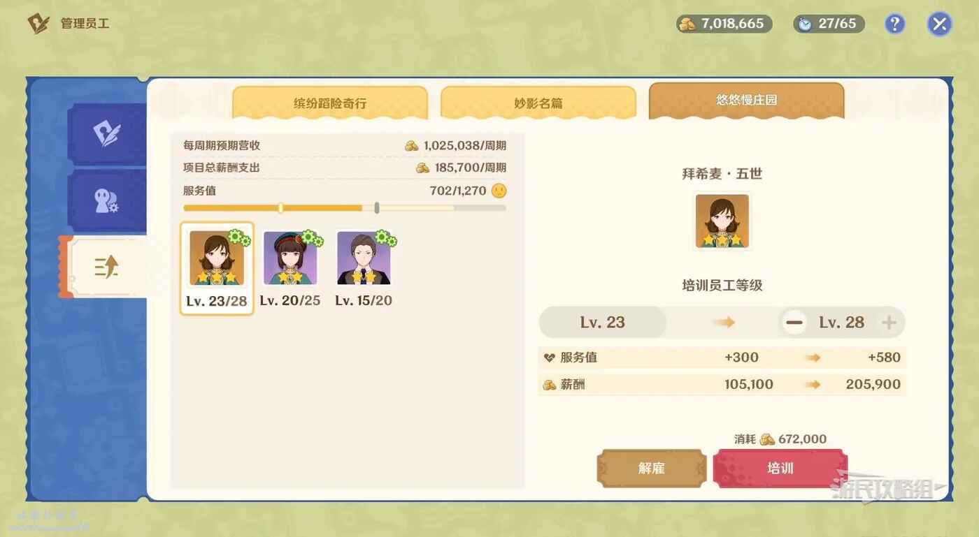 開始第三階段前,目前我們所有項目的服務度都是超出的,並且前兩個階段解鎖的夥伴事件都已經做完了。因此員工的培養在目前階段不是最優先的,只需要在升級項目之後注意是否需要補滿即可。並且目前階段的行動點比較多,每個項目升級/擴建需要的資金也比較多,所以建議根據自身情況考慮,優先保證營收額,用多餘的行動點來解鎖芙甯娜的夥伴奇遇事件。