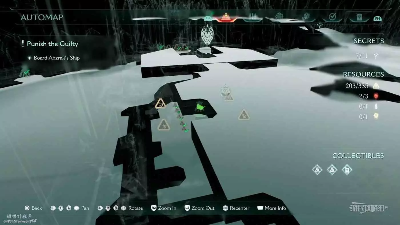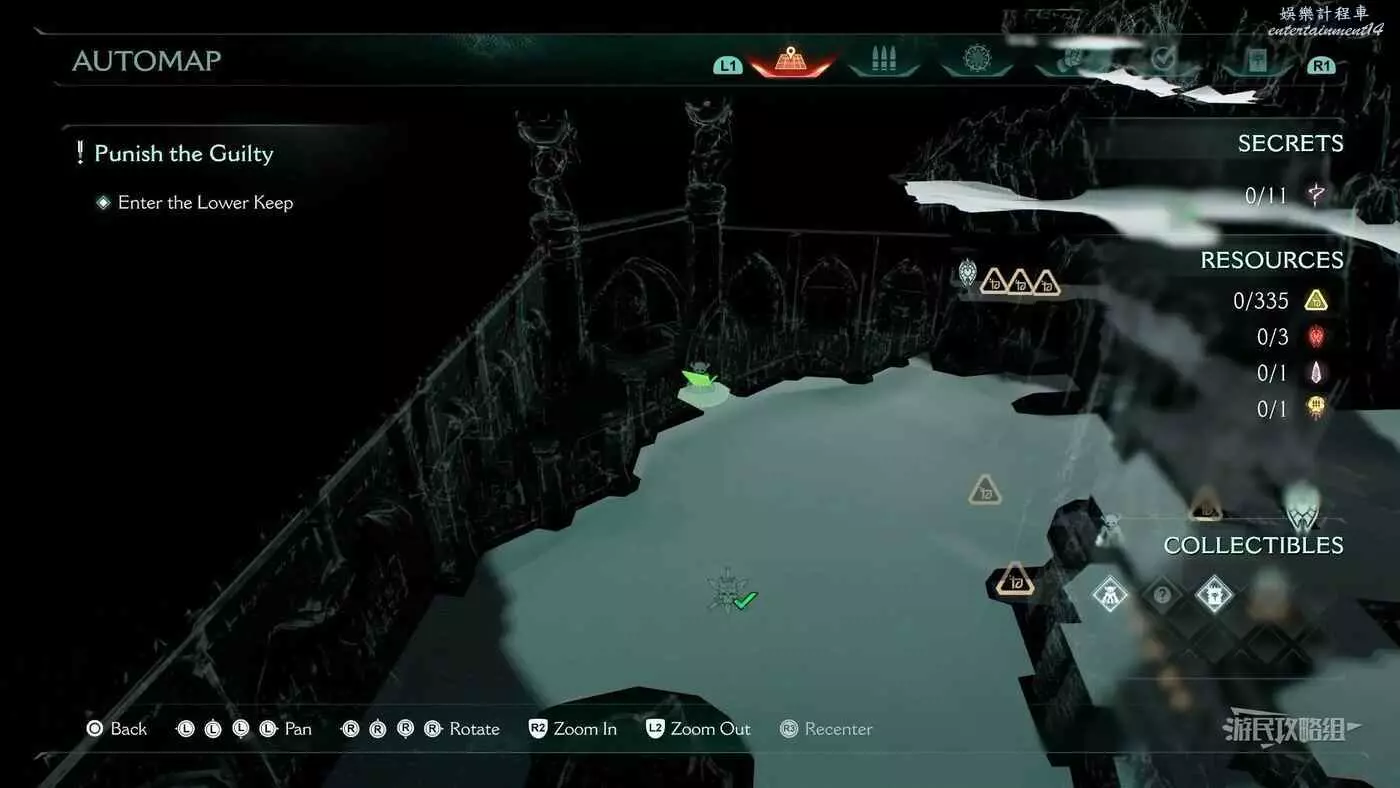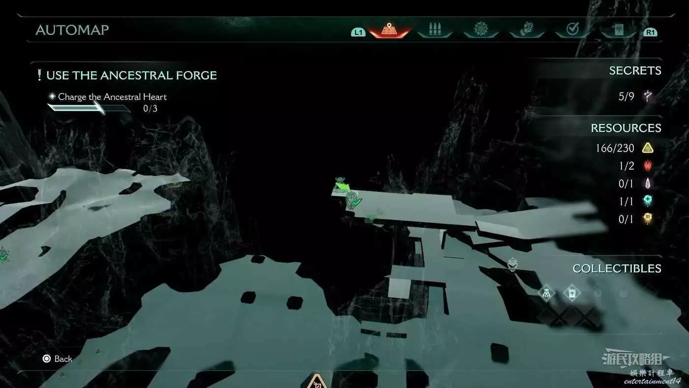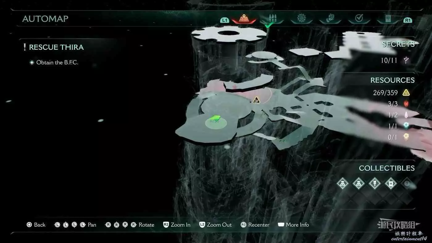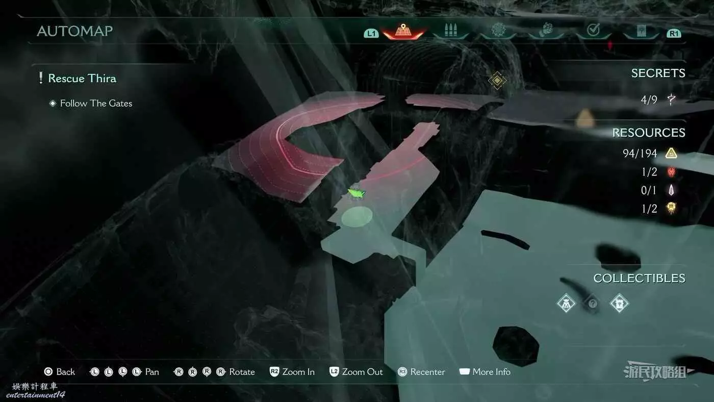 拿到第九章秘密鑰匙後,開啟平台上方的木制平台通道,跳過一系列平台後,可以看到玩具和一個帶有紅寶石的雕像,參考下方地圖位置。