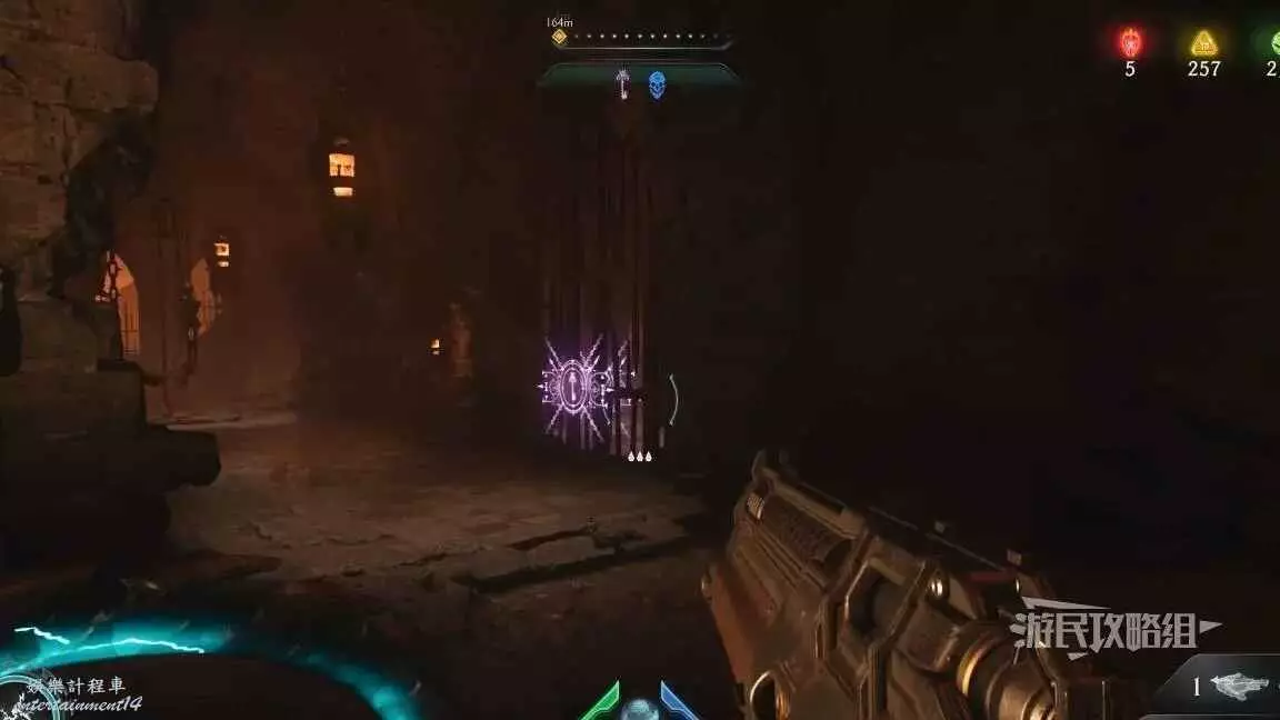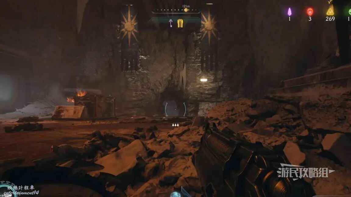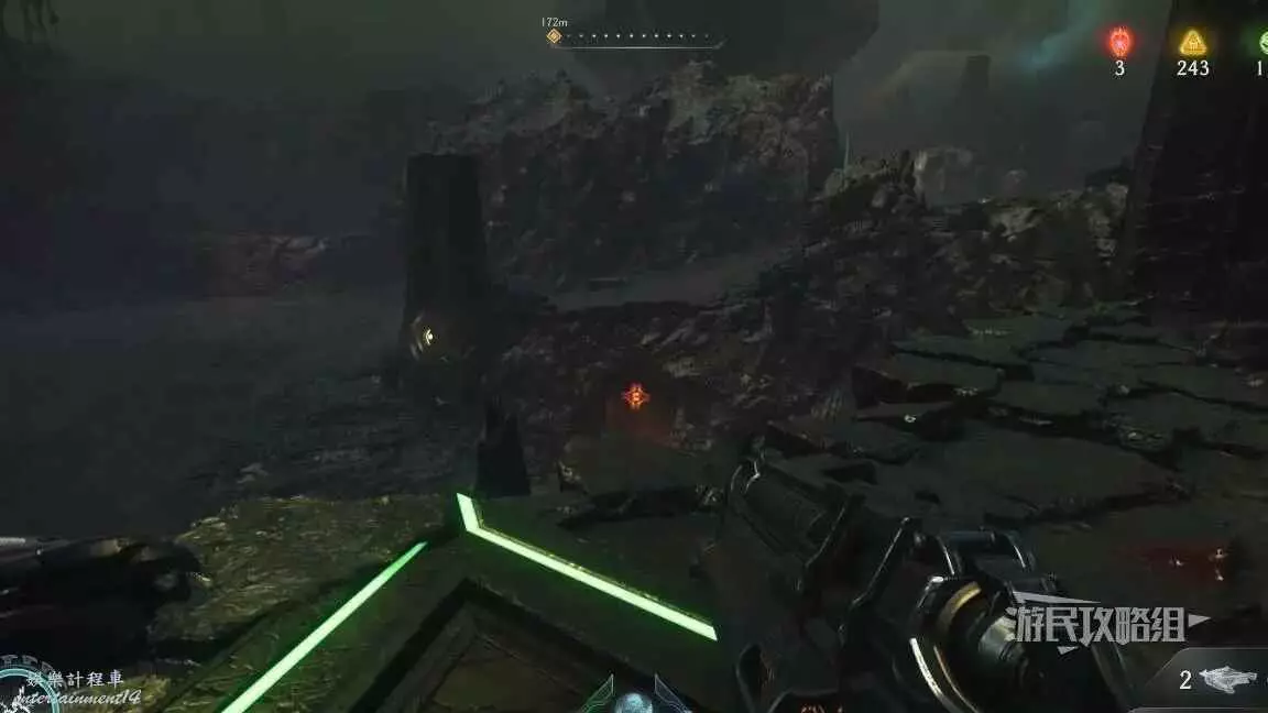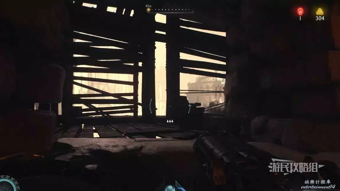 拿到超級霰彈槍後穿過後方建築,從前方縫隙跳下平台,清完小怪後找到可以攀爬的牆體,往上爬到台階頂端即可看到玩具。