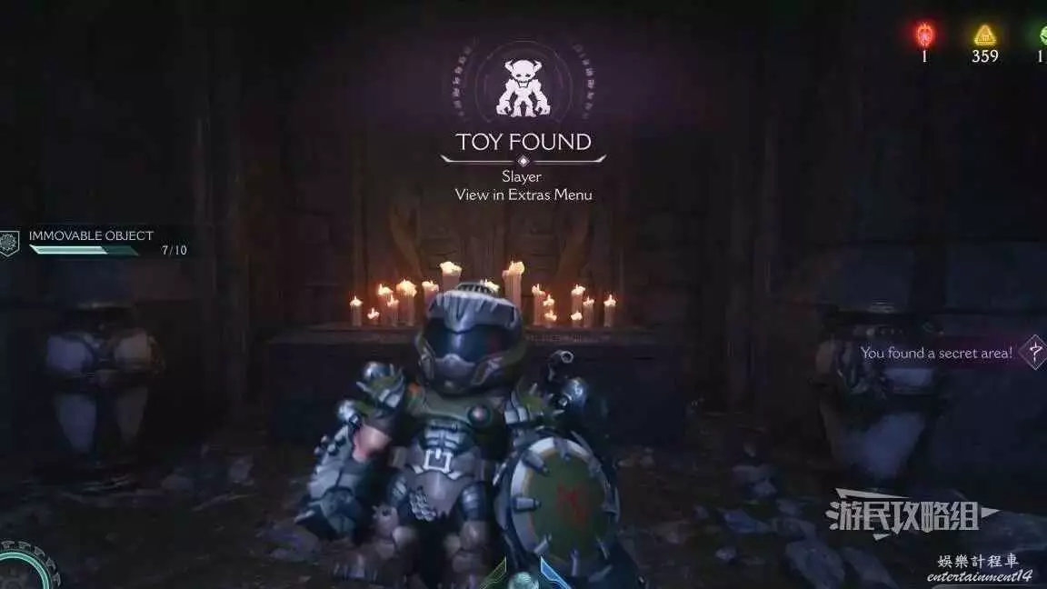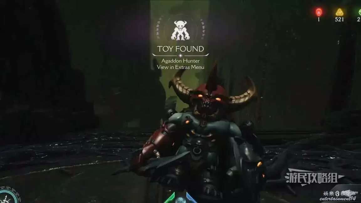 在第12章拾取黃色鑰匙卡之後,先不要前往下層,跳過豎井抓住另一側牆壁到達有黃金的房間,然後用盾擊打碎豎井對面的通風井蓋,獲得秘密鑰匙後繼續推進主線直到獲得自動炮塔符文,返回之前經過的需要秘密鑰匙的門,用鑰匙開門即可拾取玩具。
