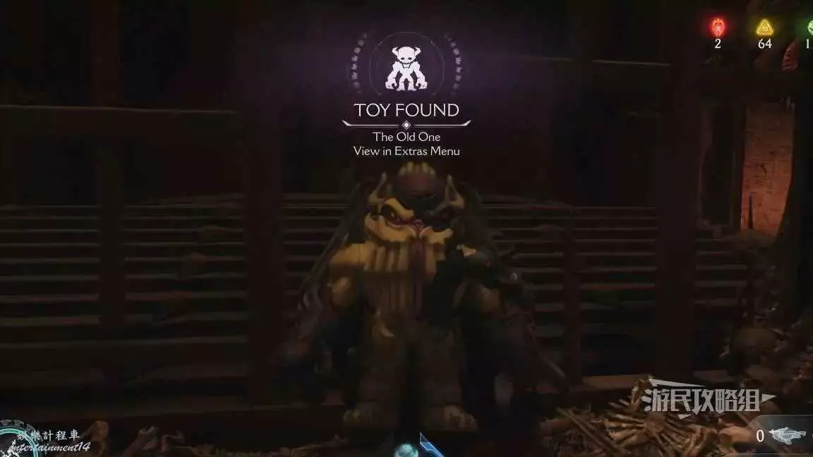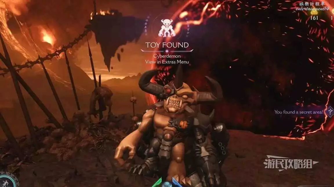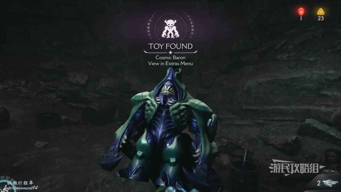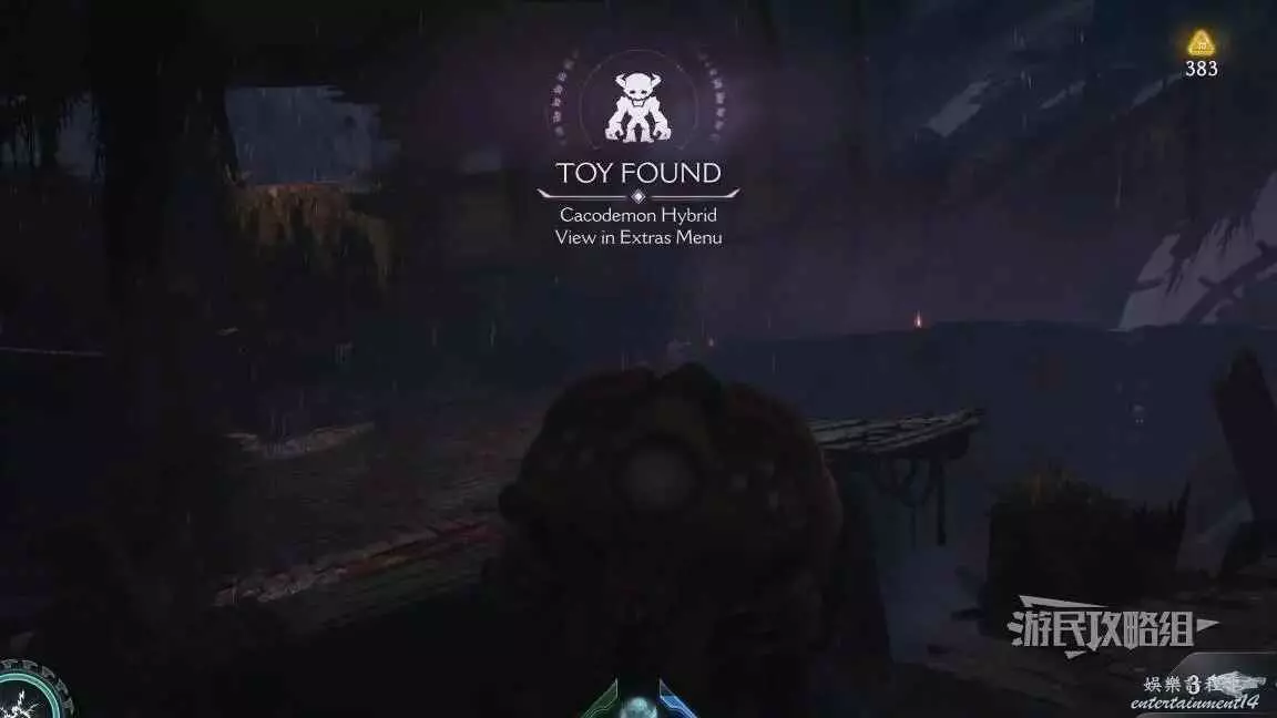在第一章摧毀4個惡魔傳送門時可以找到裝有破壞槍的武器箱,在武器箱附近的懸崖邊下方有條小路,跳下去走到頭即可看到玩具。