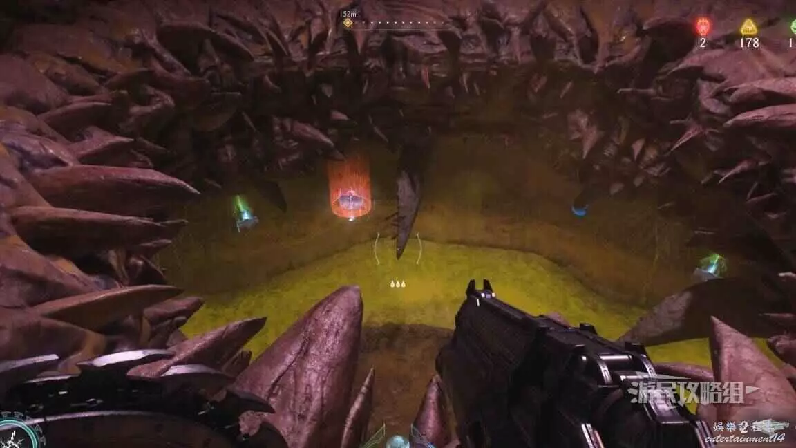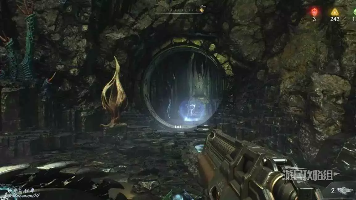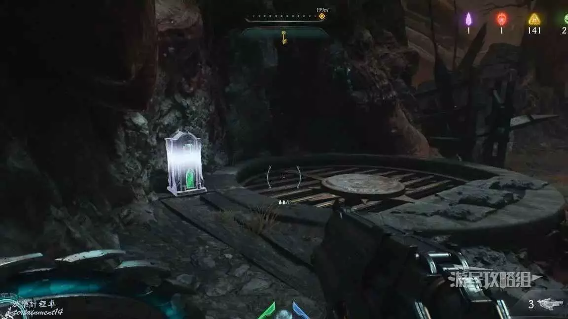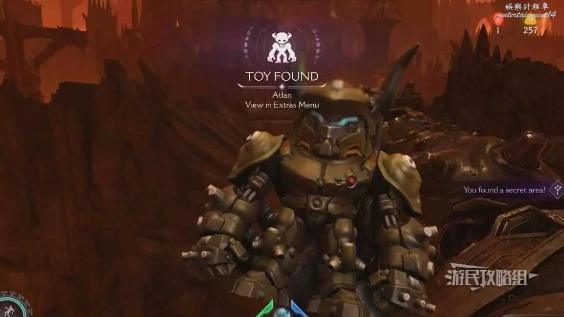 在巨獸腹部外壁上找到一個藍色齒輪,扔盾鋸使牆壁向後移動,進入後方的隱藏區域,沿著黃金痕跡走會進入一個新的區域,擊敗這裡的怪物後會出現紅色傳送門,先不要進入傳送門,玩具就在傳送門左側。