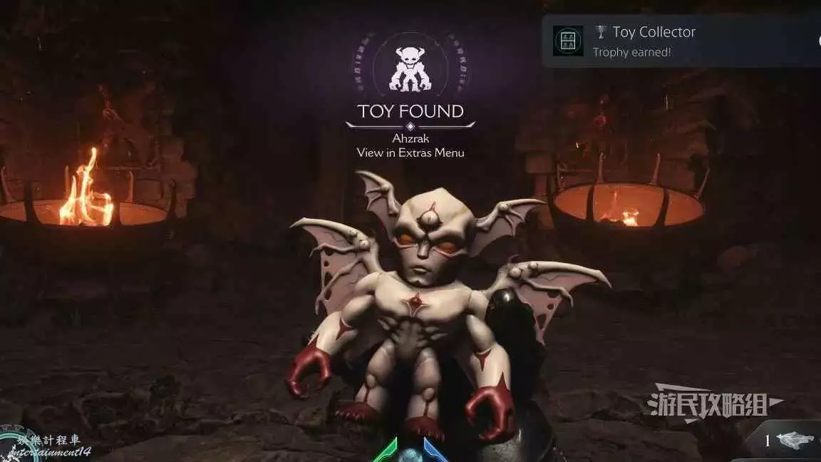 在第六章退回城牆前時,在哨兵聖壇旁邊可以看到可攀爬的岩壁,爬到頂部之後可以看到一個巨大的雕像,雕像的兩隻腳之間可以看到這個玩具。