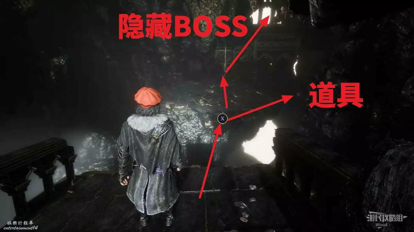 下去沿路走到下圖所示位置,沿著右側鉤爪一直走可撿一個道具,回到此處沿著繩索爬上去找到一個隱藏BOSS。